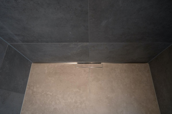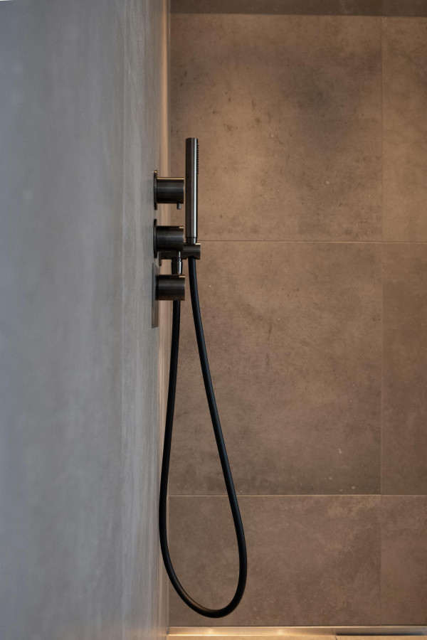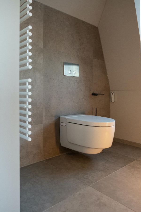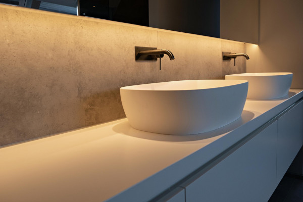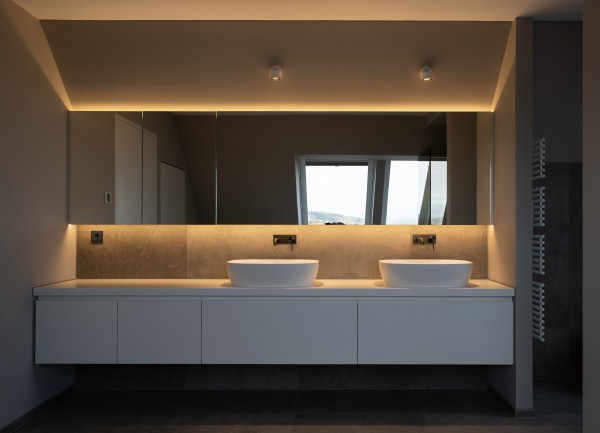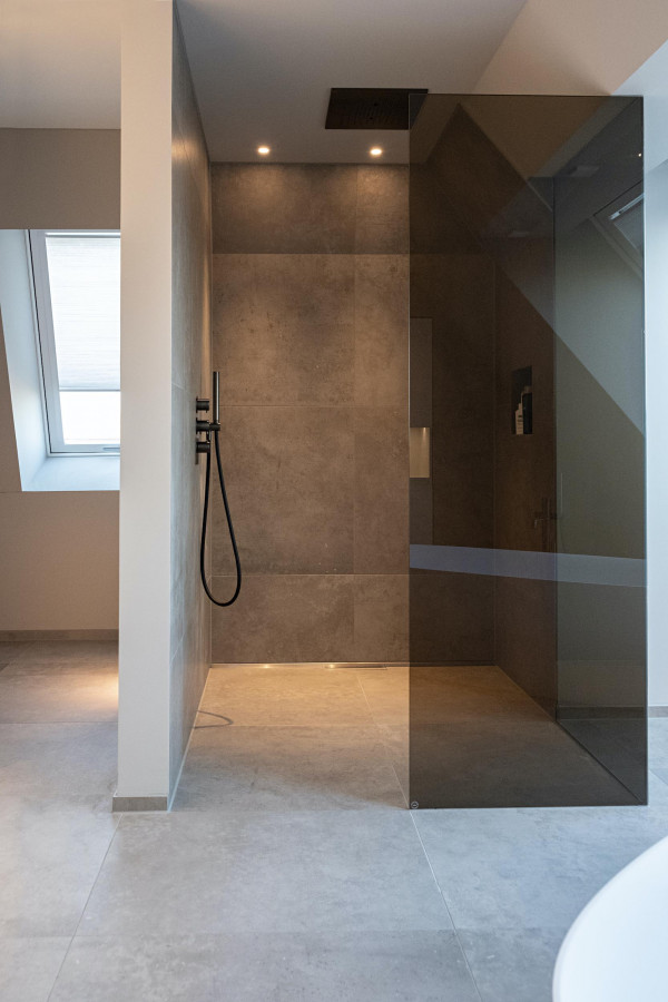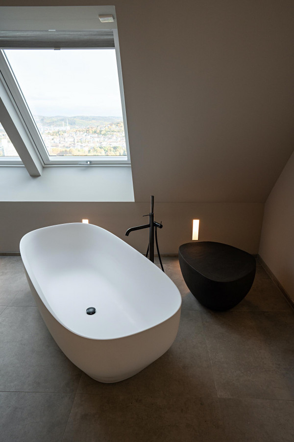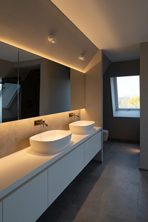 Entwurf, Detailplanung und Realisierung eines Bades im Dachgeschoss mit begehbarer Dusche, Waschtischanlage, freistehender Badewanne und separatem Dusch-WC, inklusive Material-, Farb- und Lichtkonzept.