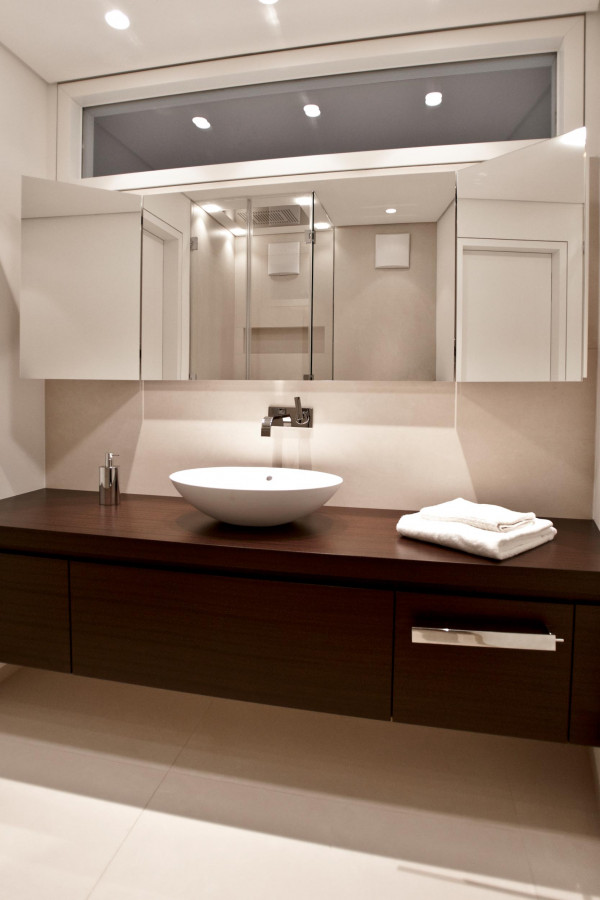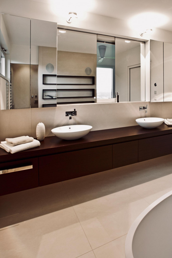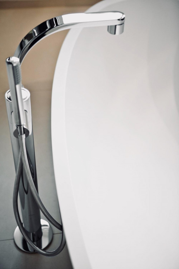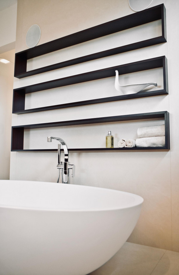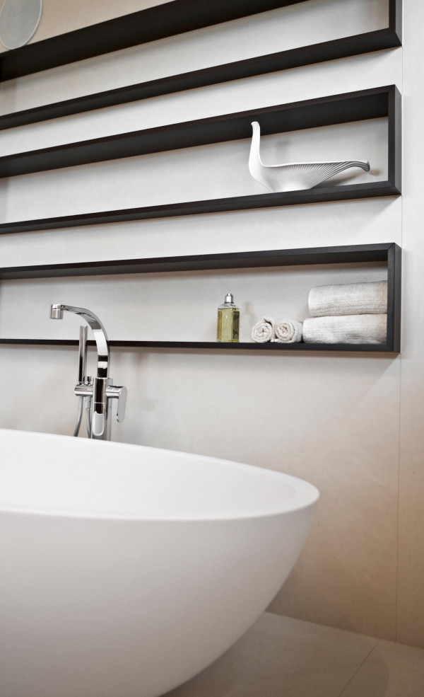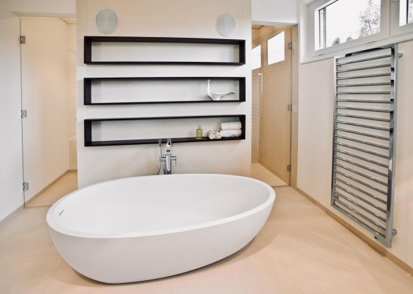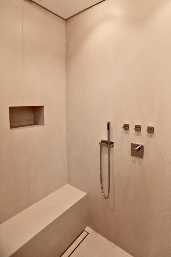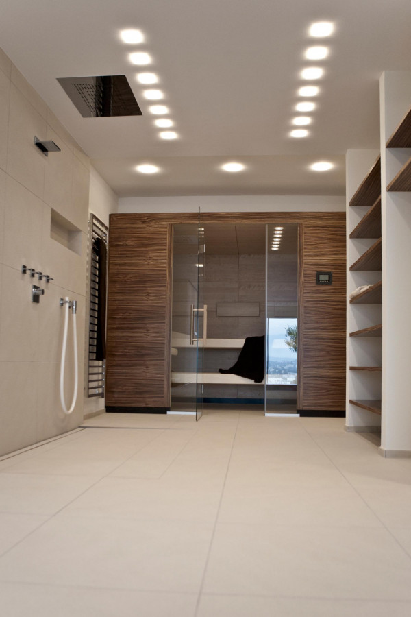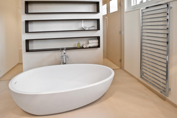 Entwurf, Detailplanung und Realisierung eines privaten Spa mit begehbarer Dusche, freistehender Badewanne, Waschtischanlage und separatem WC inklusive Material-, Farb- und Lichtkonzept.