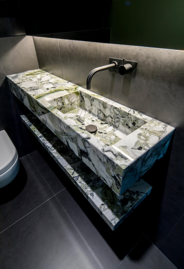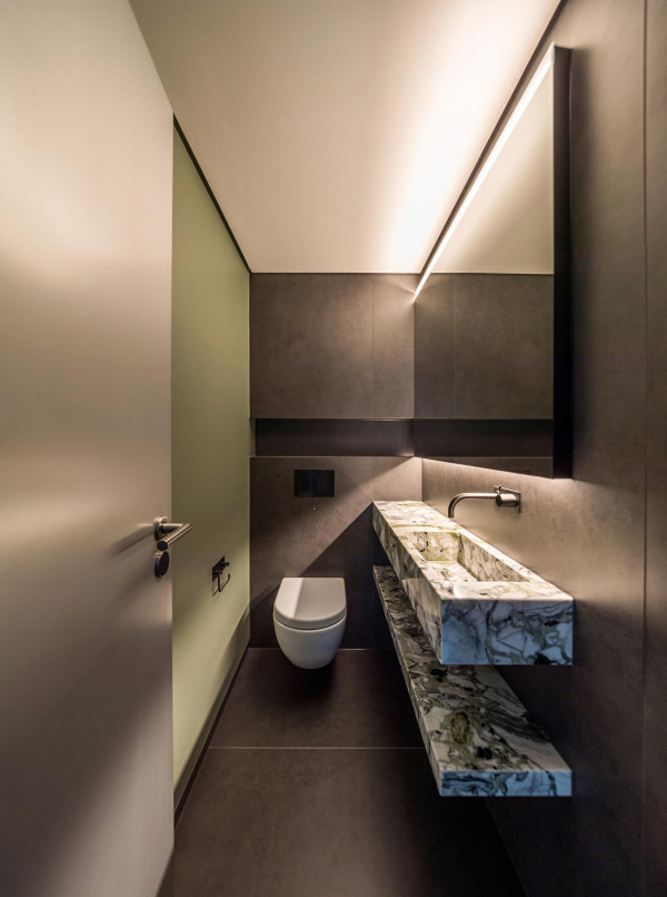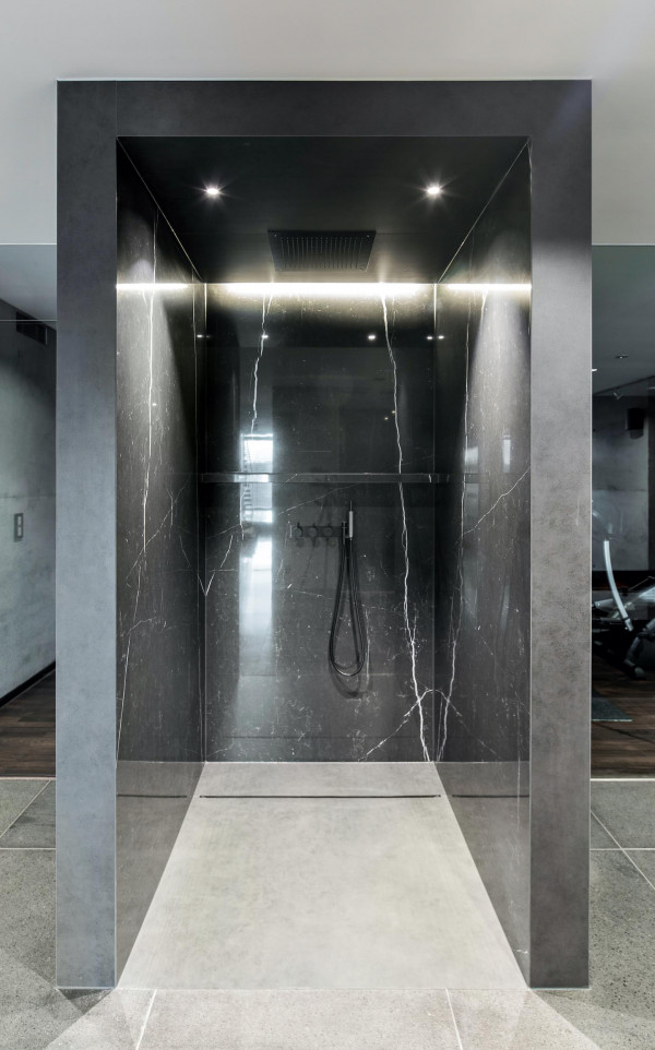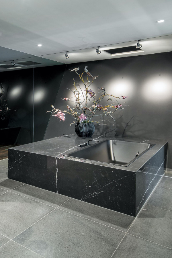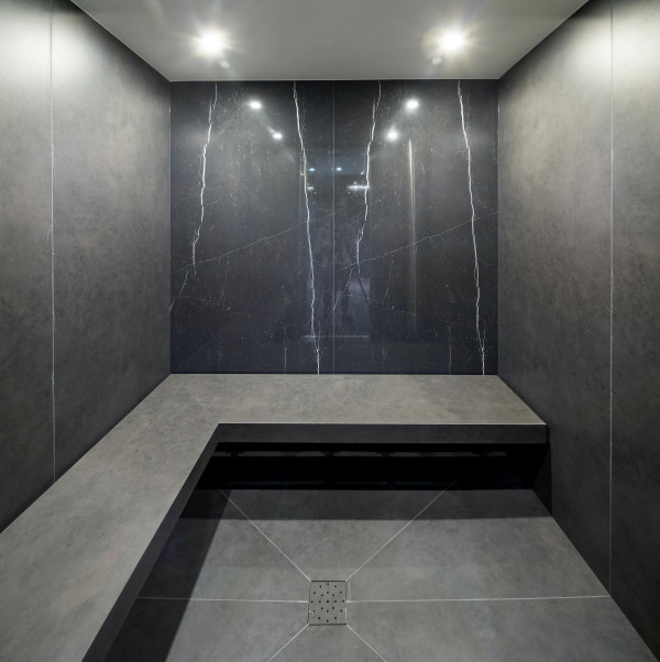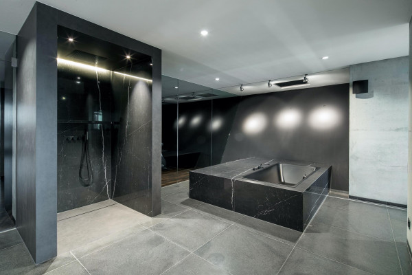 Die begehbare Dusche, die freistehende Badewanne, die Dampfdusche und das separate WC wurden inklusive Material-, Farb- und Lichtkonzept neu gestaltet.