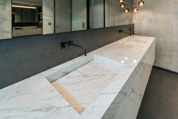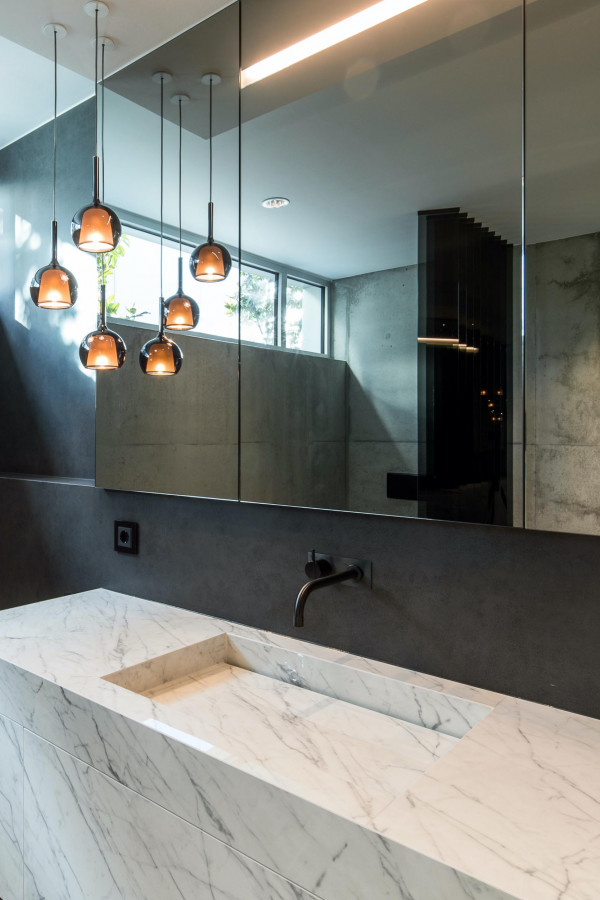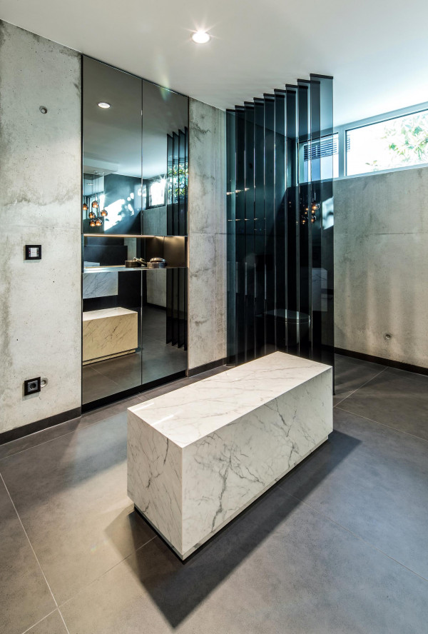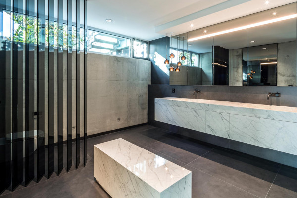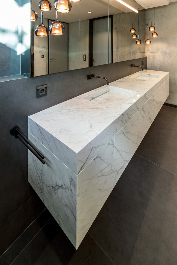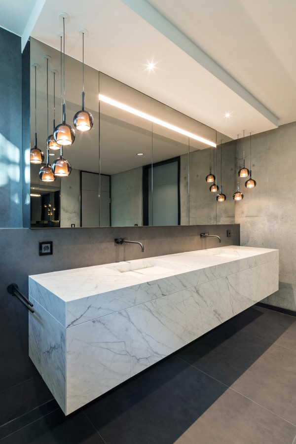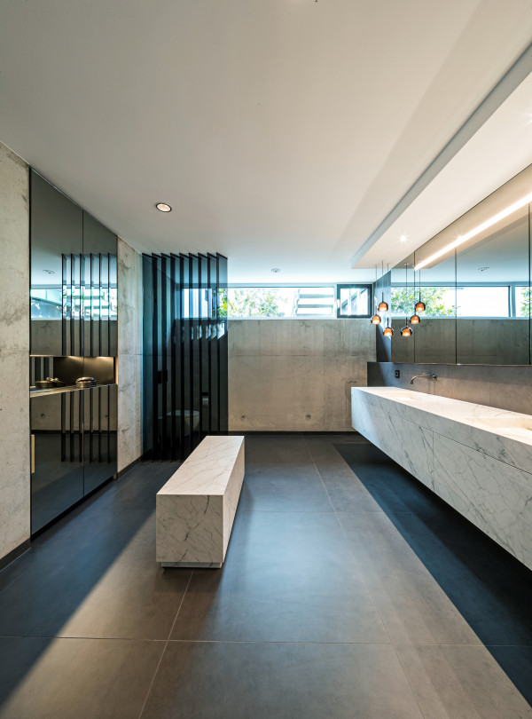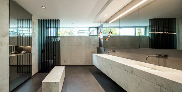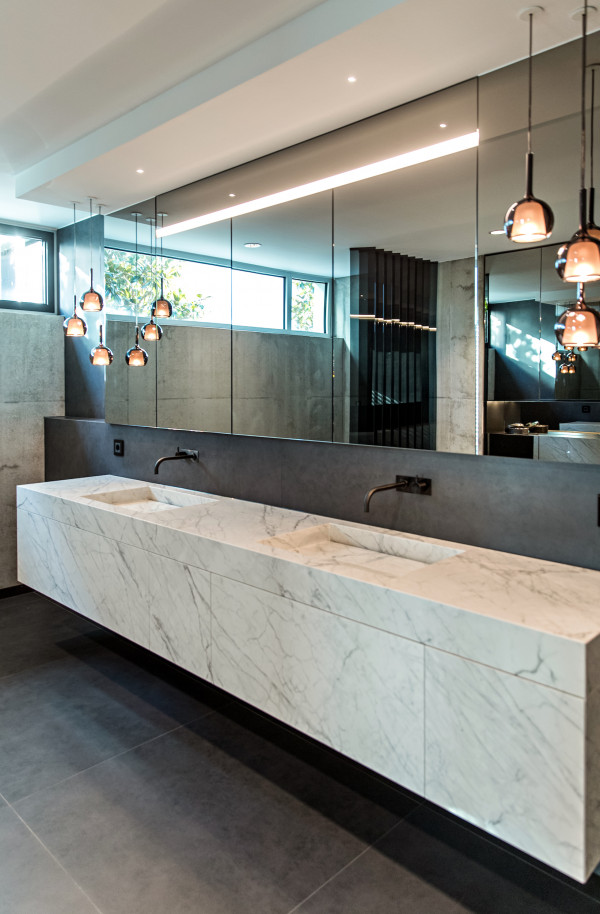 Entwurf, Detailplanung und Realisierung eines privaten Spa mit Doppel-Waschtischanlage mit Einzelbecken und Stauraummöbel, Spiegelschrank, Einbauschrank, Sitzbank, WC hinter Schamwand aus Glaslamellen,