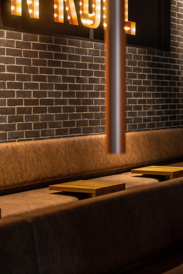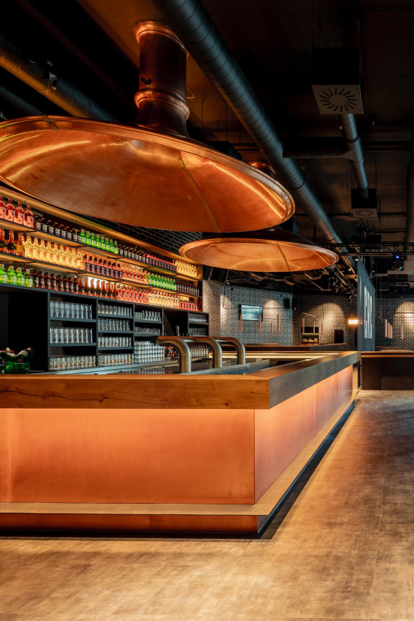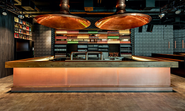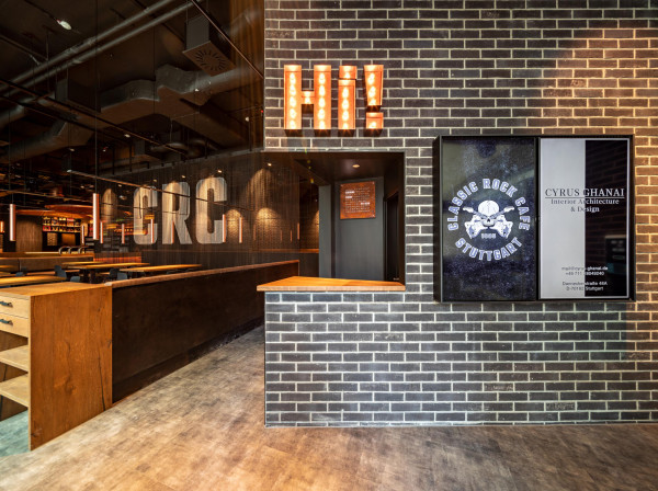 Das Classic Rock Café, kurz CRC, musste seine renommierte Kellerräume wegen einem Neubau in Stuttgart-Mitte weichen. Die Betreiber suchten nach neuen Räumen. Fündig wurden sie in einer städtischen B- Ebene am Übergang von der Innenstadt zur Universität. Die U-Bahnhaltestelle Börsenplatz öffnet sich hier in einem großen Halbrund zum Himmel. In der Tiefebene war bisher ein Mexikaner zuhause; diesen Sommer eröffnet das neue CRC. Die vertraute Kellerlage bleibt den Gästen also erhalten. Dafür verfügt der neue Standort erstmals über einen Außenbereich. Für die Neugestaltung holten sich die Betreiber den Stuttgarter Innenarchitekten Cyrus Ghanai an die Seite, dem die Stadt bereits so einige Gastronomie-Highlights verdankt. Die 325 Quadratmeter des neuen CRC hat Ghanai durch große Podeste gegliedert. In der Raumtiefe liegt der erhöhte Loungebereich, von dem aus der Blick ungestört durch das Lokal wandern kann. Hinter dem Eingang wiederum entstand, ebenfalls erhöht, ein kleiner Restauranttrakt, der durch einen Kettenvorhang von Kriskadecor zusätzlich abgeschirmt ist. Das zentrale Element des neuen CRC bildet allerdings der riesige Bartresen in der Raummitte. Die zwei markanten Kupfertrichter, die darüber schweben, sind aus der alten in die neue Location mitgewandert. Jeder Raumbereich besitzt eine eigene, auf die jeweils angedachte Nutzung abgestimmte Möblierung. So entwarf Ghanai etwa unterschiedliche hohe Tische – hier zum Essen, dort zum Chillen, an anderer Stelle zum entspannten Miteinander auf halber Höhe zwischen Sitzen und Stehen. Besonders gelang auch die Gestaltung der Wände. Dafür wurden Schriftzüge bekannter Rockbands verfremdet und auf Tapetenbahnen arrangiert. Auf den ersten Blick wirkt das vor allem dekorativ – auf den zweiten Blick auch noch unglaublich charmant und unterhaltsam.