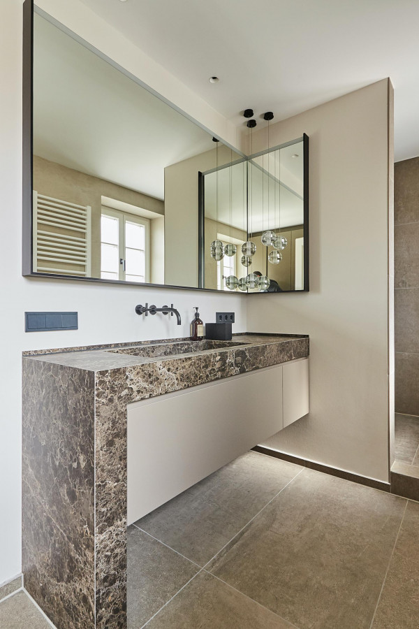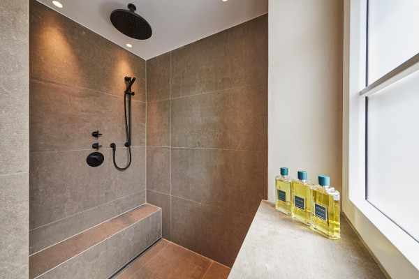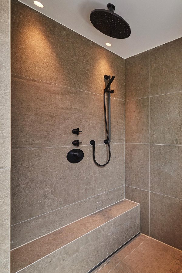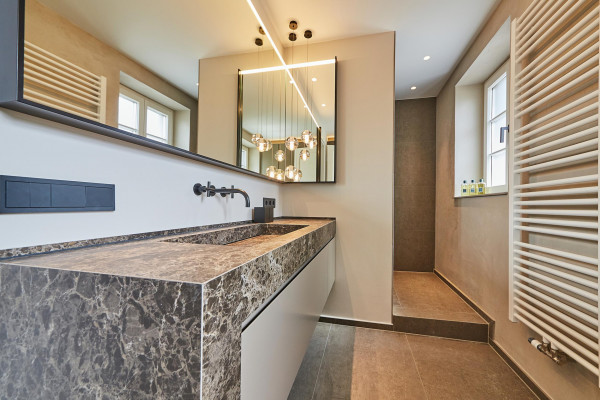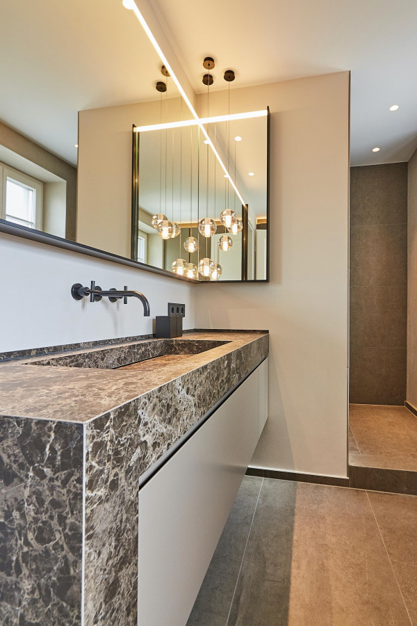 Entwurf, Detailplanung und Realisierung eines privaten Spa mit begehbarer Dusche, Waschtischanlage und Lichtspiegel nach Eigenentwurf, inklusive Material-, Farb- und Lichtkonzept.