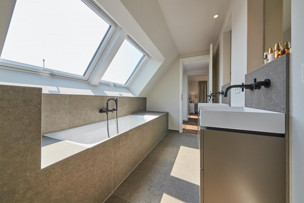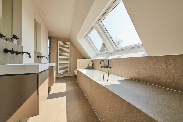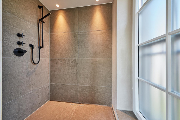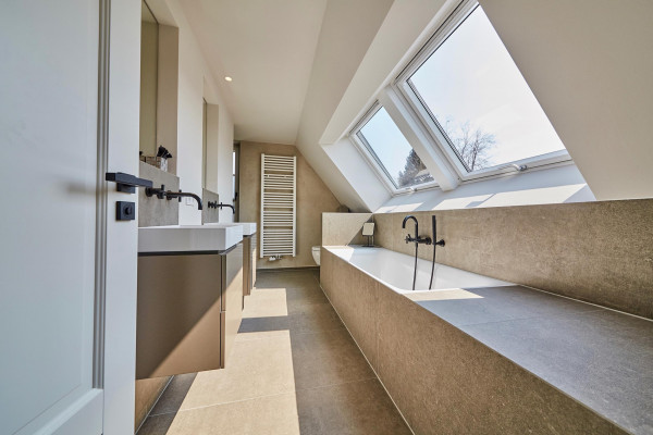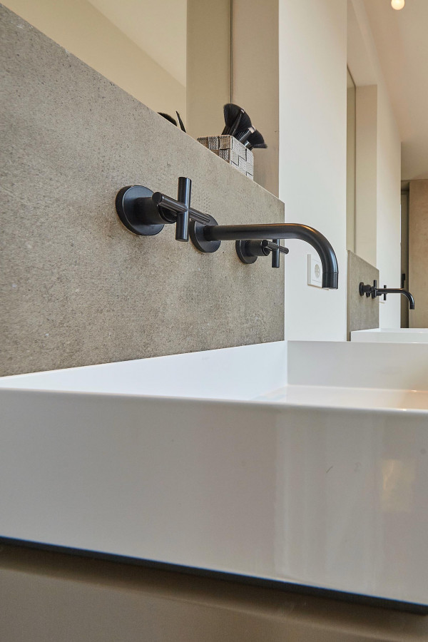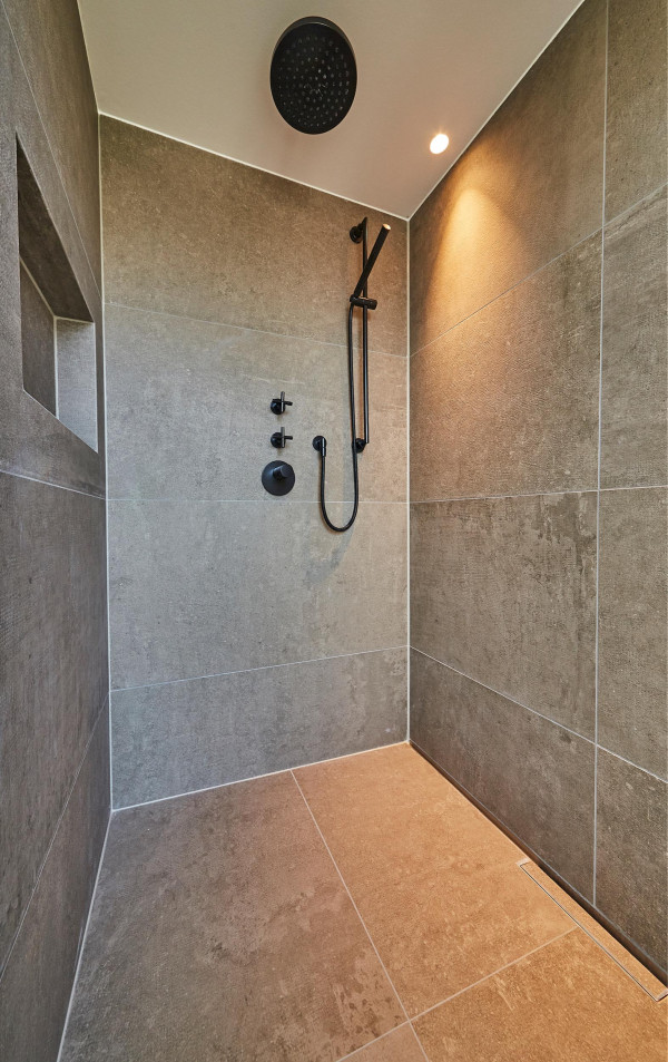 Entwurf, Detailplanung und Realisierung eines privaten Spa mit begehbarer Dusche, Badewanne, Doppel-Waschtischanlage mit Einzelbecken nach Eigenentwurf, inklusive Material-, Farb- und Lichtkonzept.