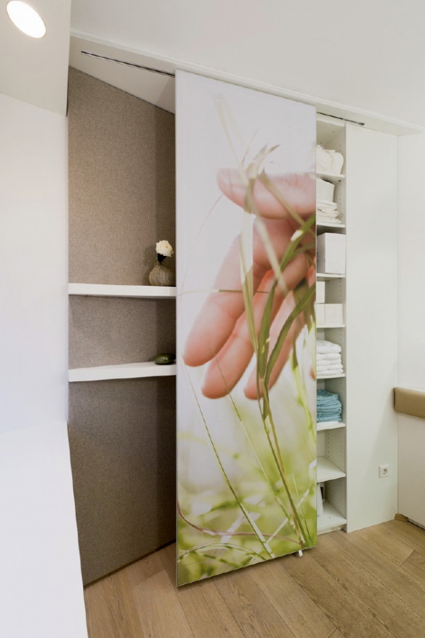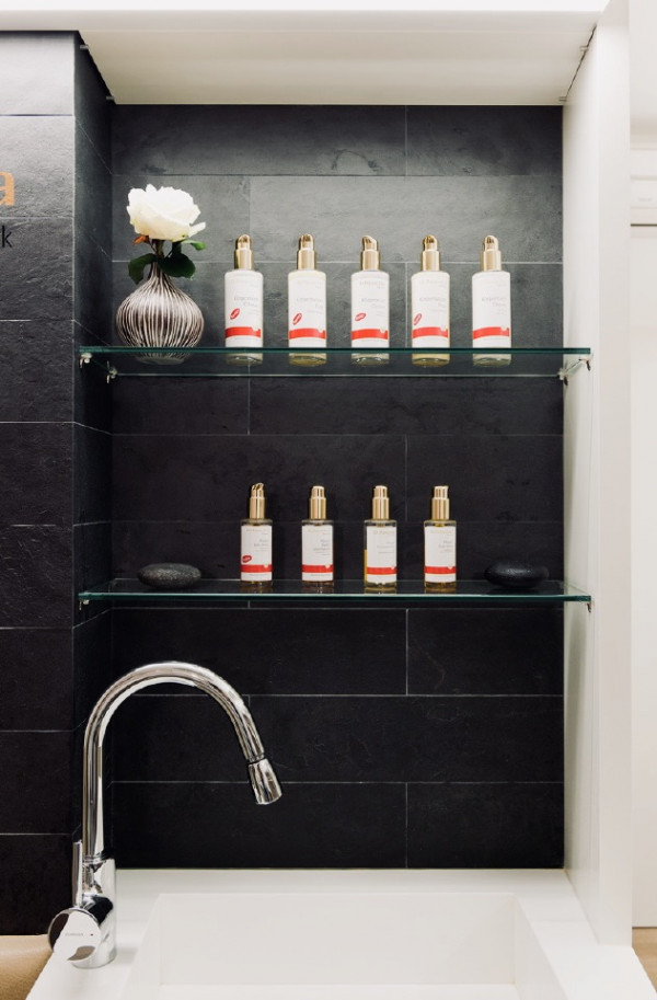 Ein Fußwaschbecken versteckt sich in der Sitzbank. Wird eines der Polster abgedeckt, kann das Becken über den Waschtischmischer mit ausziehbarem Auslauf befüllt werden. Ein Schrank für Handtücher, Fläschchen und Tiegel ist unsichtbar in eine Raumecke eingebaut. Seine Schiebetür ist mit einem Imagebild bezogen, das die Natürlichkeit der Marke symbolisiert. Mithilfe von Spiegeln wird in dem kleinen Raum zusätzlich Tiefe erzeugt.