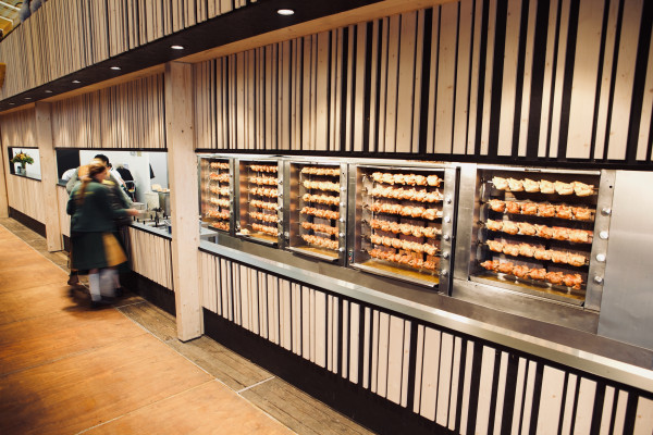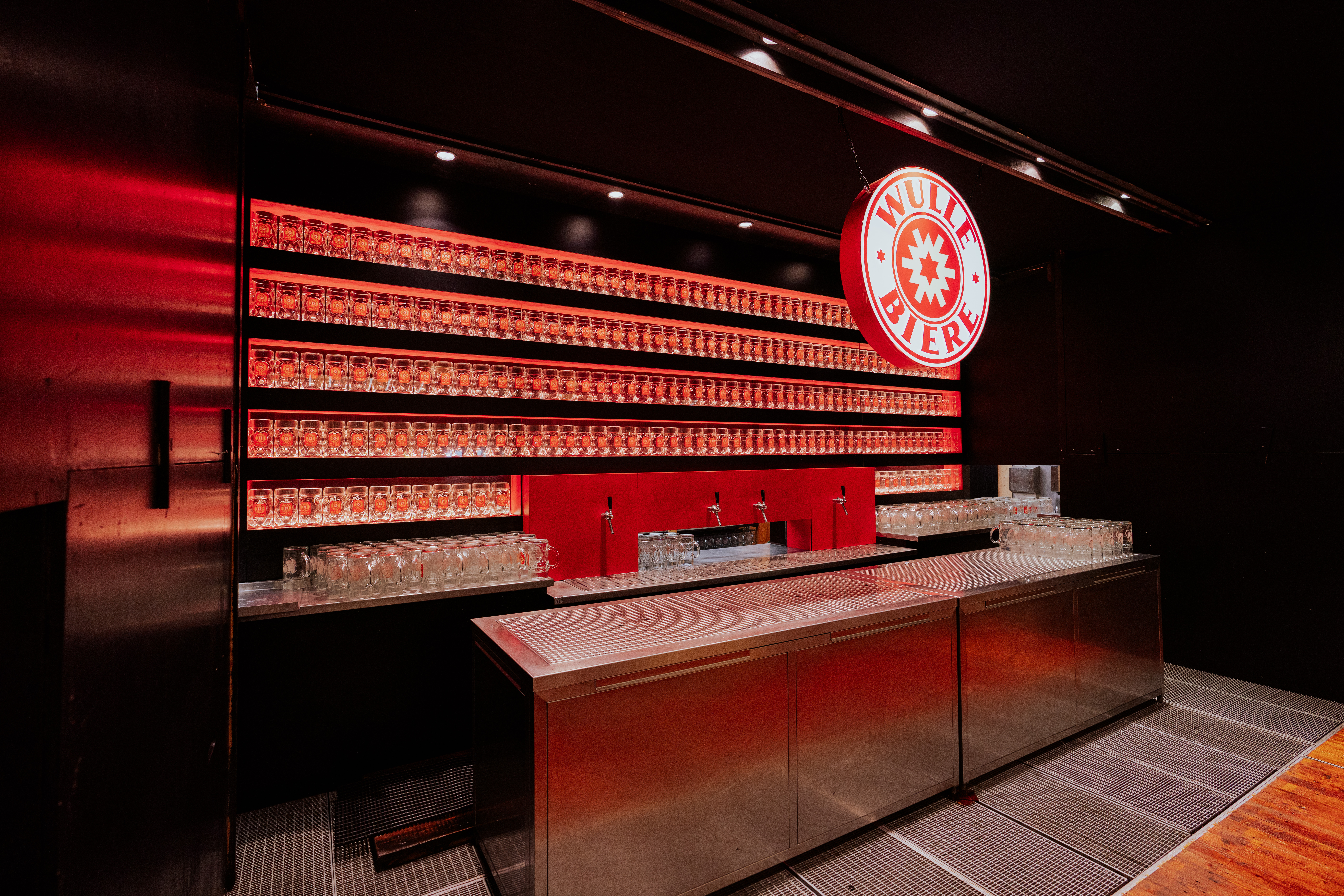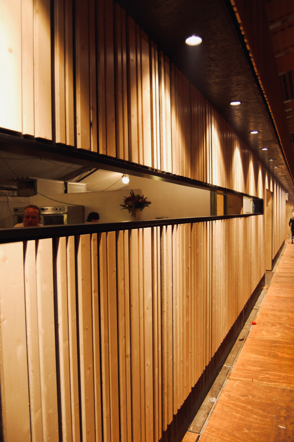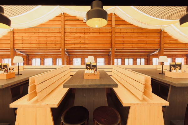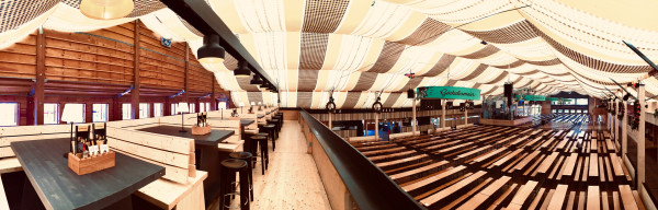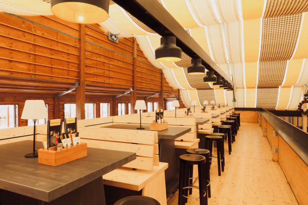 Die Innenraumfassaden der Festzelte tragen eine dezent grafische Handschrift. Auf schwarz lasierte 3-Schichtplatten wurden Holzleisten aus naturbelassener, heller Fichte symmetrisch angeordnet, um so den gewünschten Barcode-Look mit 3-D-Effekt zu erzeugen.