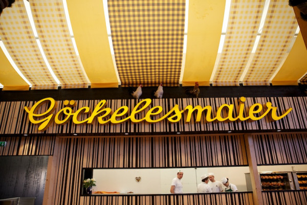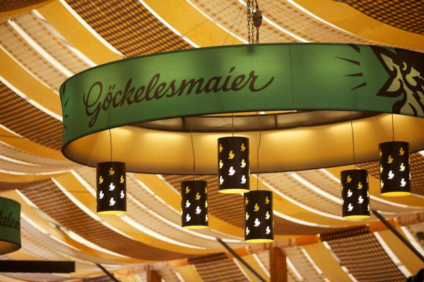 Entwurf, Planung und Realisierung der 4.200 Gäste fassenden Göckelesmaier-Festzelte auf dem Cannstatter Wasen und Frühlingsfest. Neue Organisation der Gastronomiezeile, Dekoration und Beleuchtung in Modulbauweise.