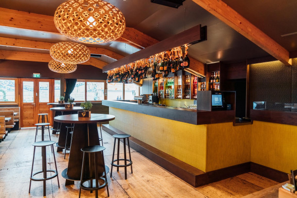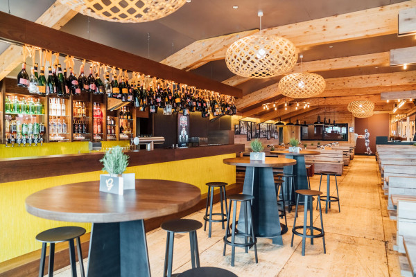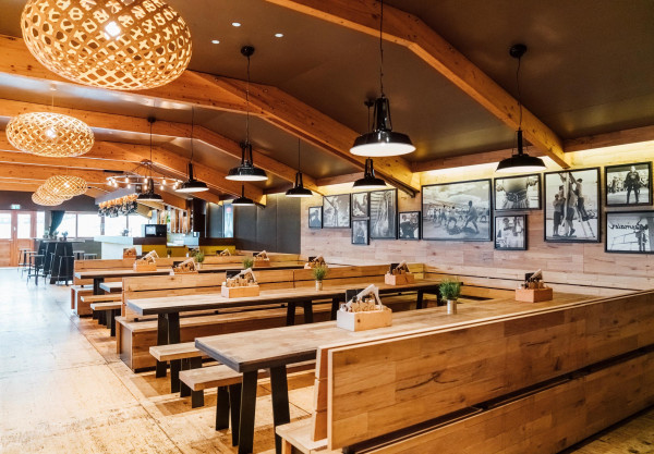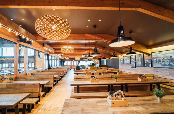 Warmes Holz, gedämpftes Licht und historische Schwarz-Weiß-Fotografien aus mehr als 80 Jahren Göckelesmaier-Geschichte dominieren die Atmosphäre in Karls Loge, die über eine eigener Bar, einen eigenen DJ und einen seperaten eigenen WC-Bereich verfügt. In der beliebten Loge finden 180 Personen an 8er und 16er Tischen Platz. Charakteristisch für die eigens entworfene Möblierung aus aufgedoppeltem Altholzparkett sind die langen Stammtische, die großzügigen, U-förmigen Sitznischen sowie Bänke mit Stauraumkisten. Die Front der Bar wurde mit gelbem Vinyl, der CI-Farbe von Göckelesmaier, belegt und die Rückwand der Loge mit Stoffpaneelen ausgekleidet. Das Lichtkonzept integriert verschiedene, eigens entworfene Pendelleuchten.