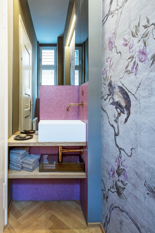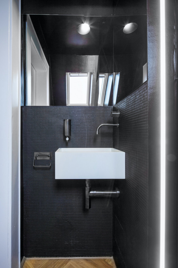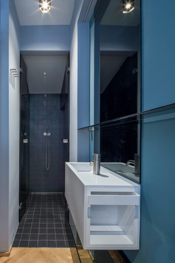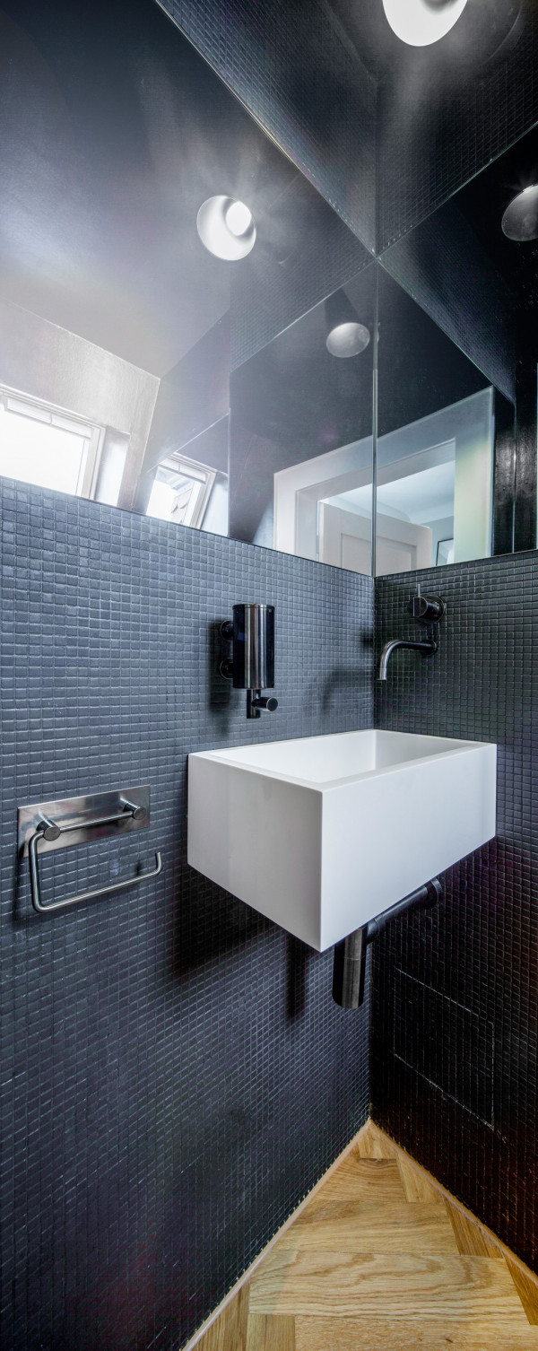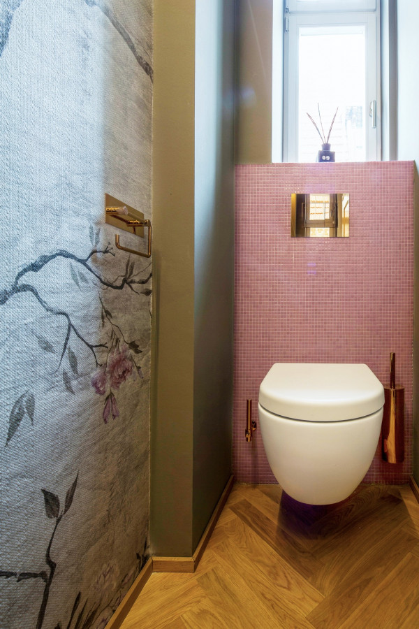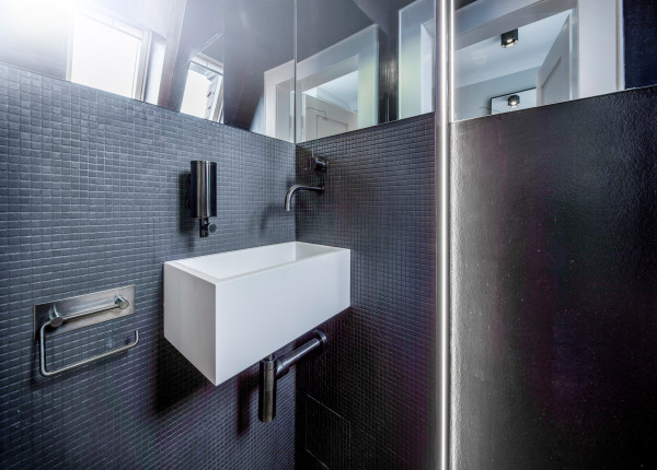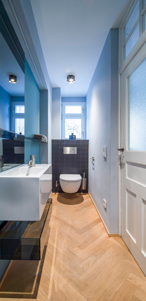 Entwurf, Detailplanung, Bemusterung und Neugestaltung der Gäste- WC Räume eines Showrooms in einer denkmalgeschützten Stadtvilla inklusive Material-, Farb- und Lichtkonzept.