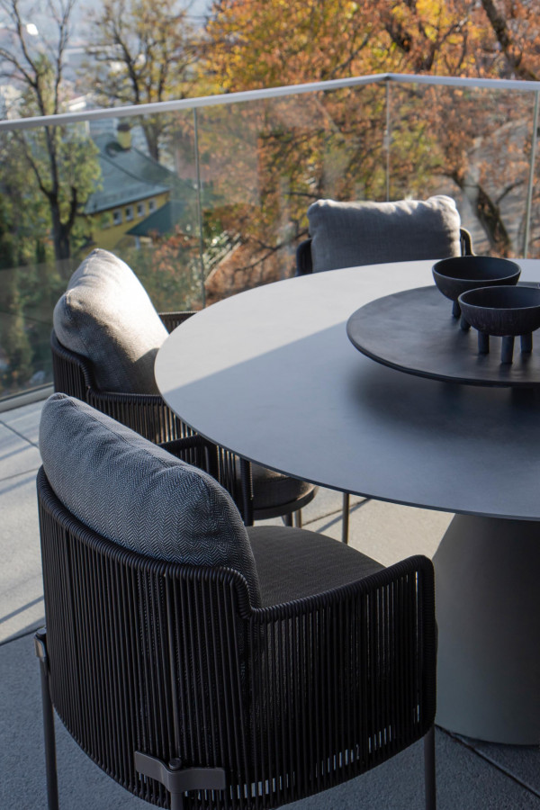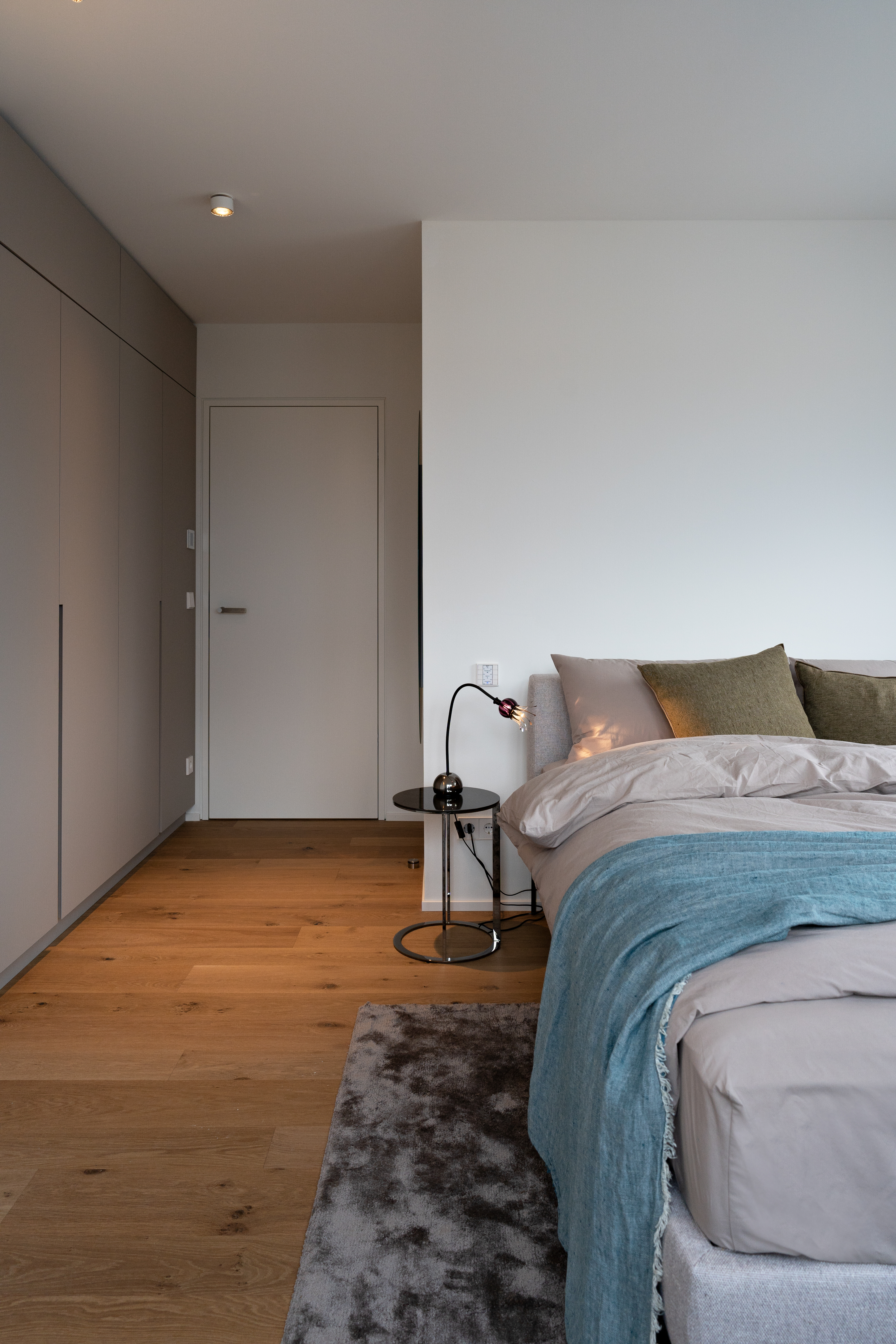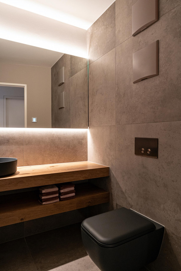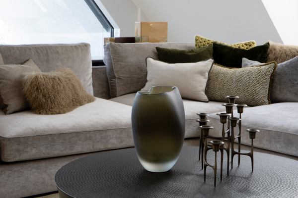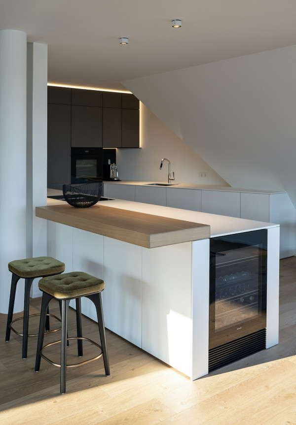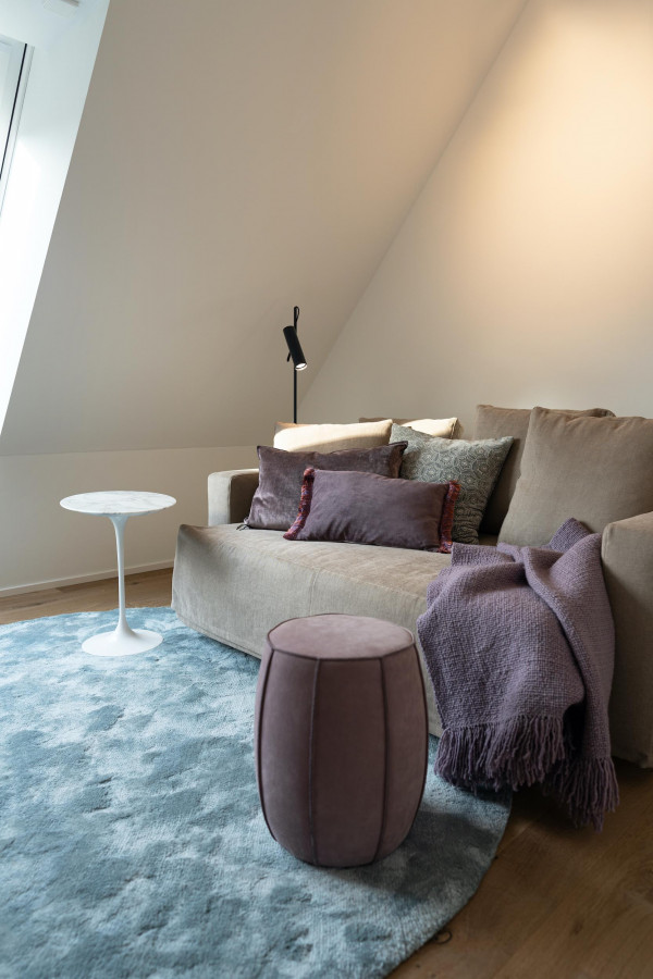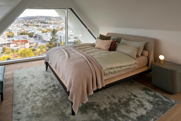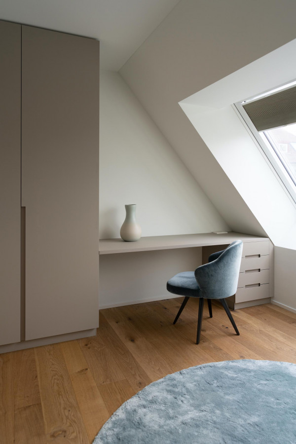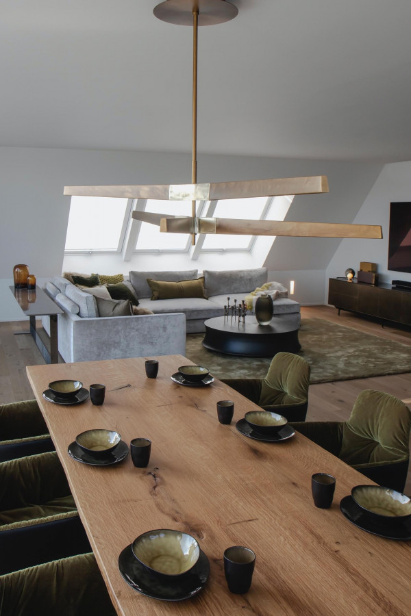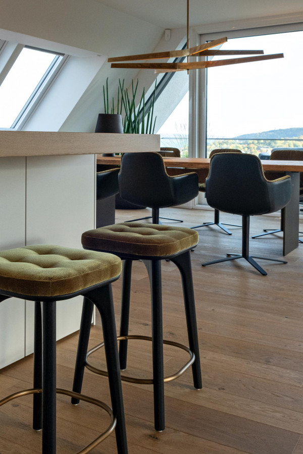 Was gibt es für einen Innenarchitekten Schöneres als eine „Carte Blanche“? Hoch über den Dächern der Stadt liegt diese Maisonette-Wohnung mit spektakulärem Blick; Küche, Wohn-, Ess-, Schlaf-, Ankleide- und Gästezimmer, Bädern, WC, Nebenräumen und großzügigem Außenbereich. Die frisch gebackenen Eigentümer beauftragten Cyrus Ghanai mit der Entwicklung des Gesamtkonzepts und dessen Realisierung inklusive Farb- und Materialschemata sowie der losen Möblierung. Um den offenen Charakter des Habitats eindrucksvoll zu unterstreichen, versetzte der Innenarchitekt zunächst den Küchenbereich im unteren Geschoss und konzipierte ihn komplett neu. Sämtliche Einbauten wie beispielsweise der Schreibtisch und der Kleiderschrank im Gästezimmer sowie der Schrank im Ankleidezimmer wurden passgenau entwickelt und mit einer exquisiten Oberfläche versehen. Kleines Highlight: die Neukonzeption und Realisierung der licht anmutenden Treppe, die sich harmonisch ins Ganze fügt. Bei der Entwicklung des Farbkonzepts griff Ghanai auf die Farbpalette zurück, die die Umgebung natürlicherweise bereithält. Grau changiert bisweilen metallisch bis Blassblau und Gelbtöne kräftig Oliv- bis Messingfarben, ergänzt um einige wenige Kontrastfarben. Bei der Auswahl der losen Möblierung lag das besondere Augenmerk auf hochwertigen Stücken, haptischen Stoffen und Strukturen.