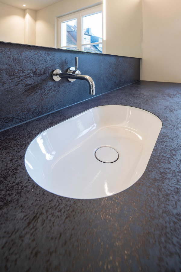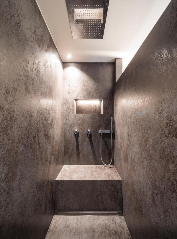 Entwurf, Detailplanung und Realisierung eines privaten Spa mit begehbarer Dusche, Badewanne, Doppel-Waschtischanlage mit Einzelbecken nach Eigenentwurf, inklusive Material-, Farb- und Lichtkonzept.