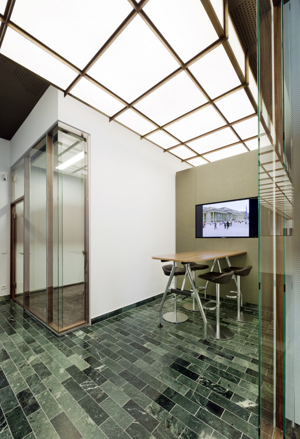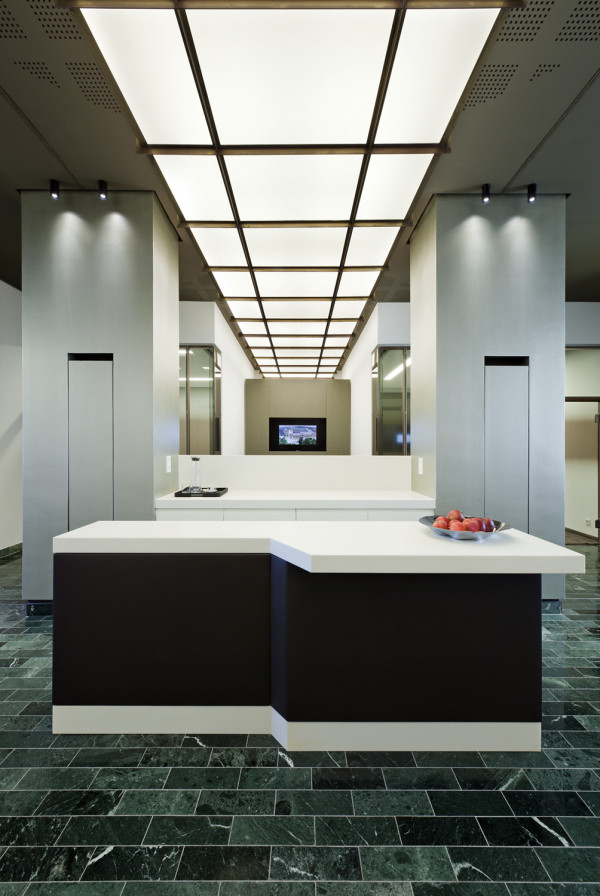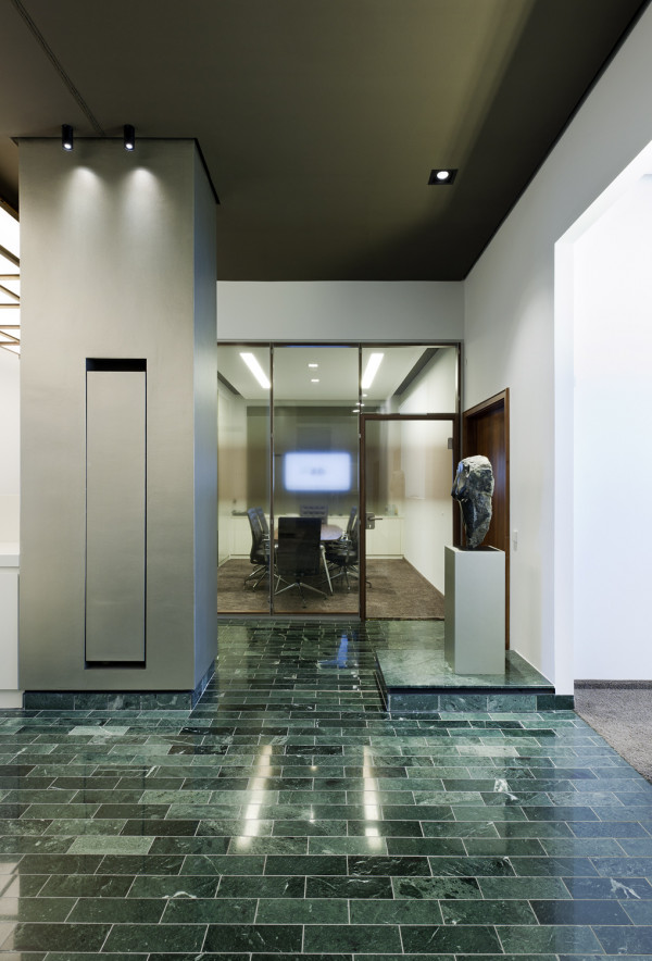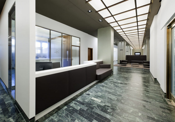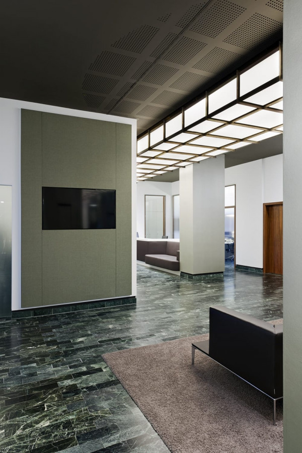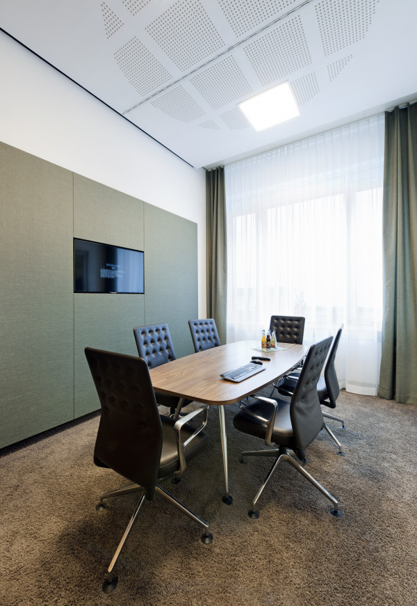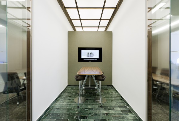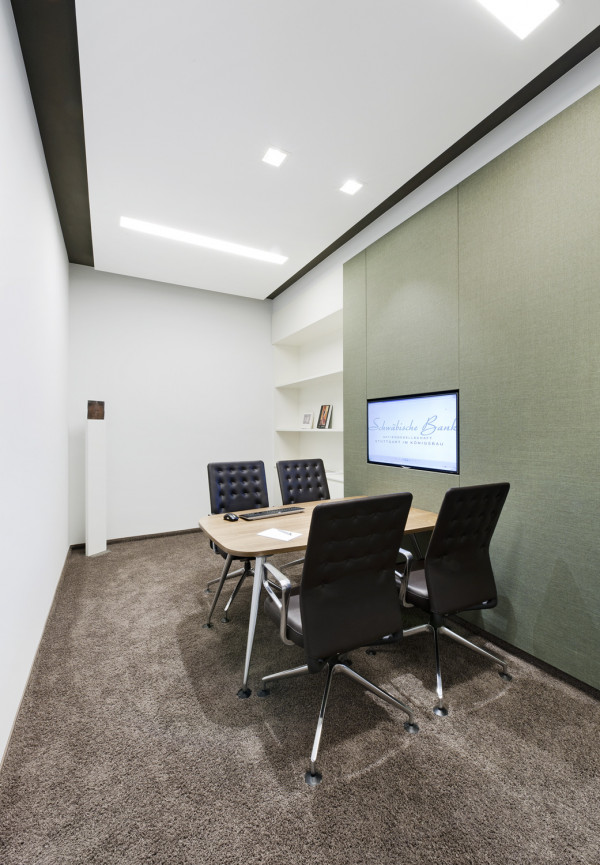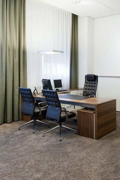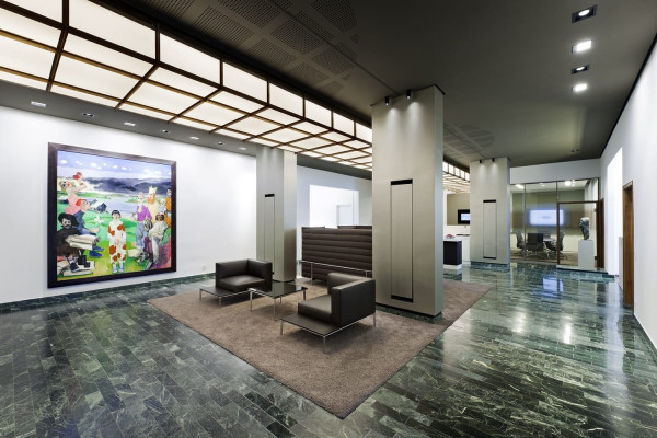 In 2 Bauphasen überarbeiten wir die kompletten, zweigeschossigen Raumstrukturen. Lediglich feste Bauelemente bleiben bestehen. Die neue Innenarchitektur erfüllt modernste Kriterien an Arbeitsabläufe, Kommunikation und Funktionalität: In den Büro-, Sozial-, und Meetingräumen schaffen wir eine kollegiale Atmosphäre, während die repräsentativ gestalteten Empfangsräume kundenrelevante Aspekte wie Wertbeständigkeit, Transparenz und Seriosität visualisieren. Mit dem Einsatz von Schall absorbierenden Materialien wird die gesamte Raumakustik optimiert. Im Zuge der umfassenden Modernisierung erneuern wir auch den Kunstbestand.