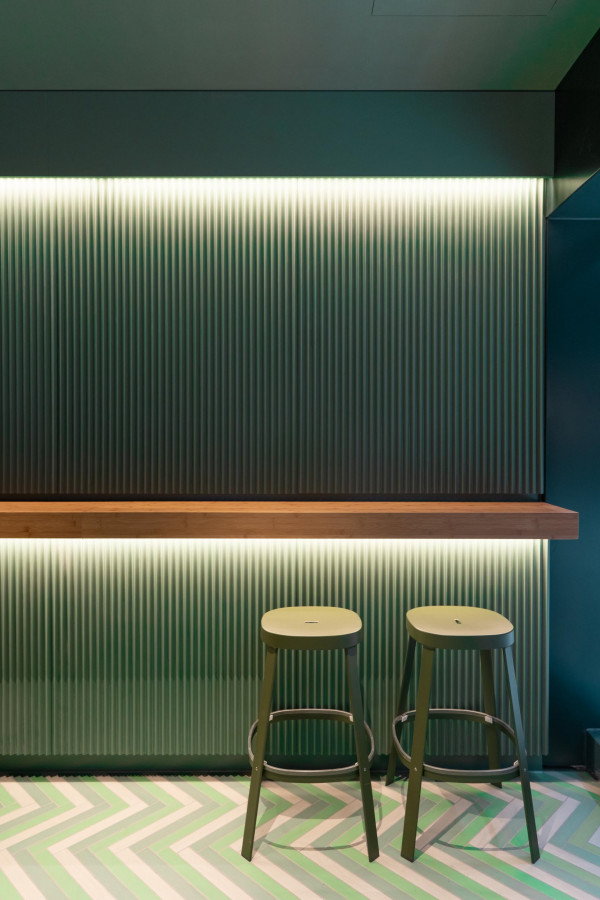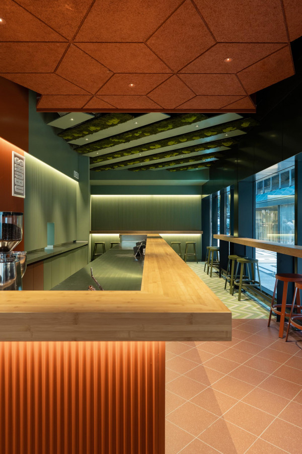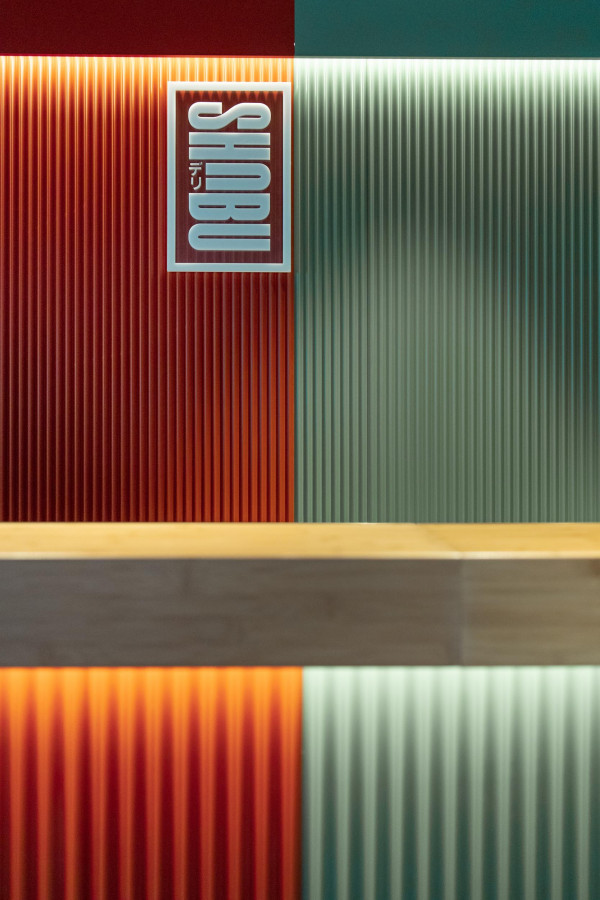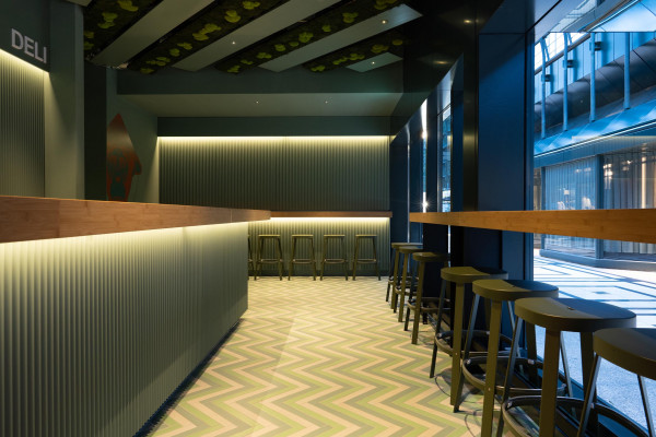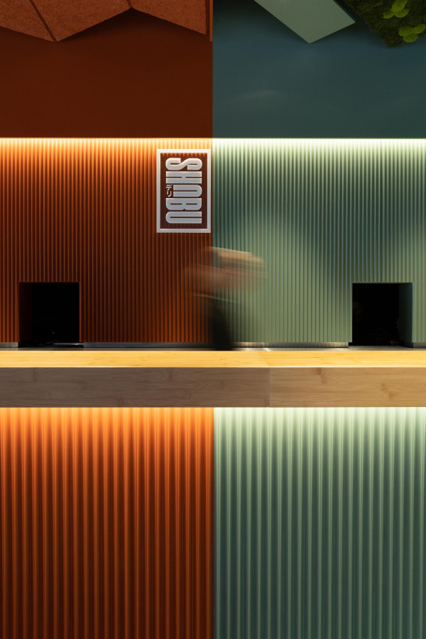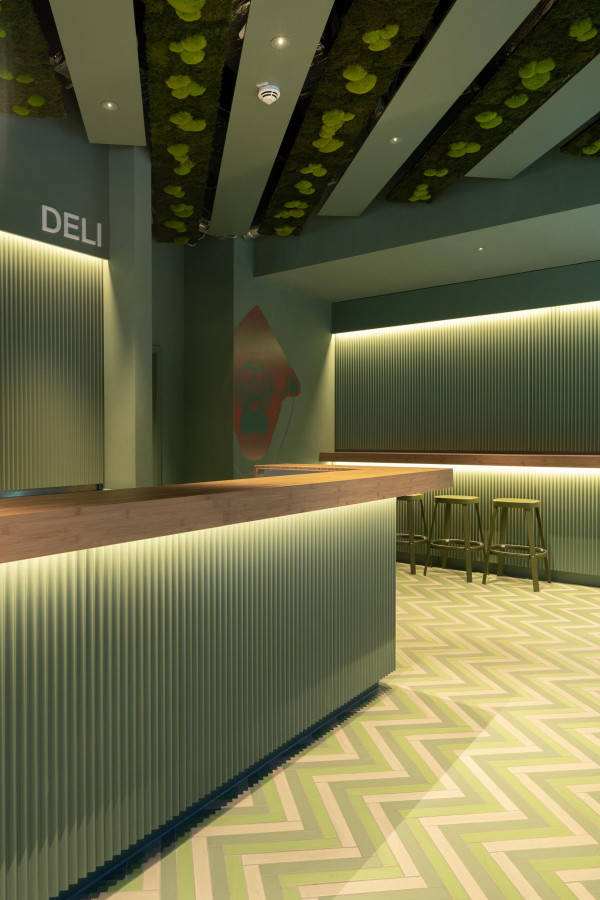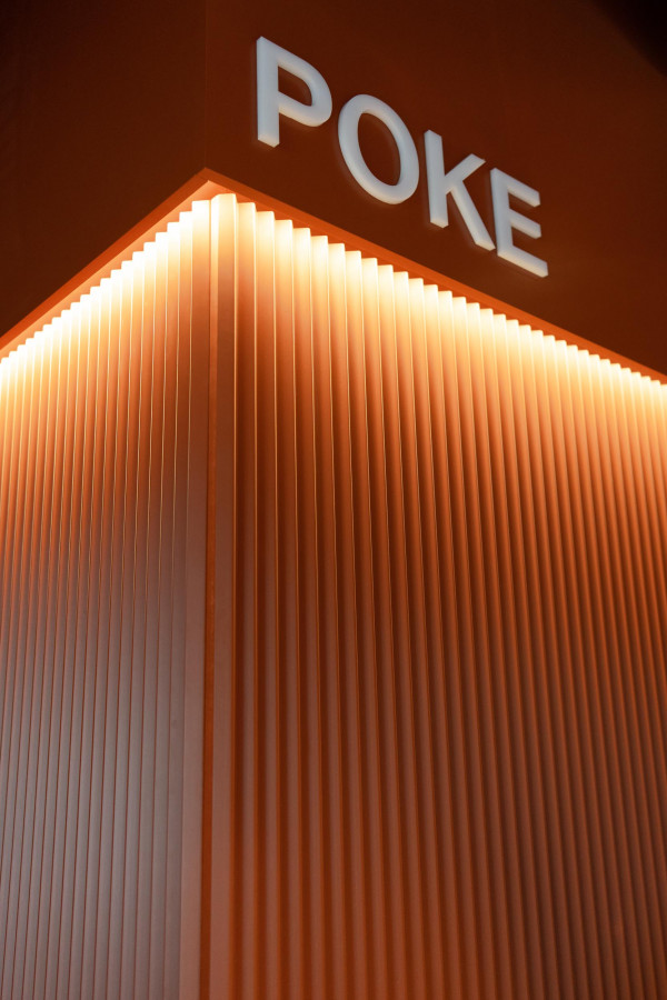 Konzept, Entwurf, Detailplanung und Realisierung, Möblierungs-, Farb-, Material- und Lichtkonzept. Gilt es, zwei unterschiedliche Gastronomiekonzepte in einem Raum eigenständig und doch harmonisch abzubilden, braucht es Fingerspitzengefühl. Hierfür entwickelte Cyrus Ghanai eine beide Konzepte verbindende, einheitliche Materialität. In die Wand- und Thekenvertäfelung aus MDF wurde eine plisseeartige Struktur gefräst. Hinterleuchtet wird die Konstruktion mittels LED. Den Boden ließ Ghanai mit Fliesen belegen, die das gestalterische Thema charmant fortführen. Für Orientierung im Raum sorgt die konsequent zweigeteilte Farbgebung. Das Poké erstrahlt in warmem Safranrot; das Deli in gedecktem Avocadogrün. Die Thekenbretter aus Bambusholz fungieren als optische Klammer beider Farbwelten.