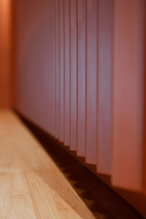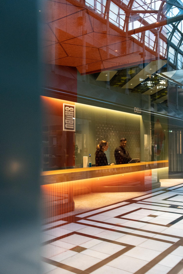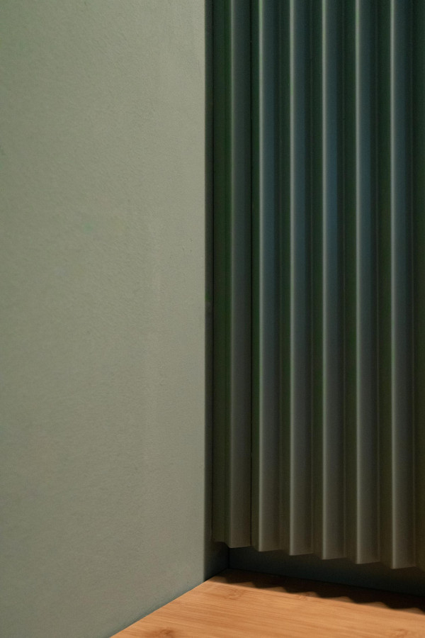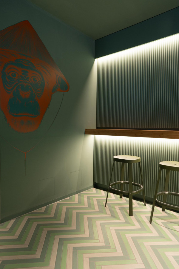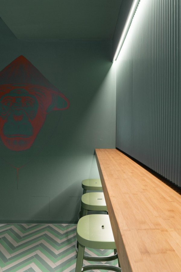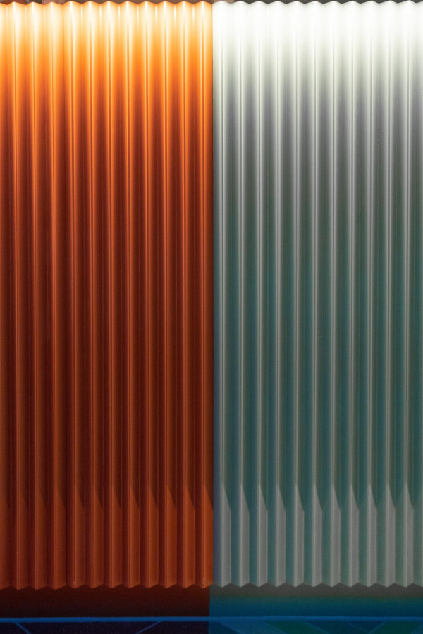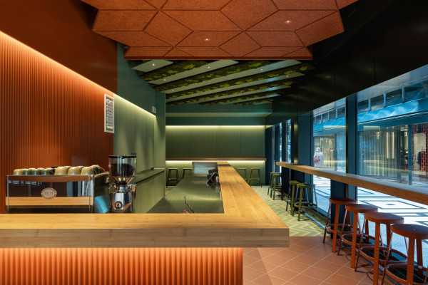 Konzept, Entwurf, Detailplanung und Realisierung, Möblierungs-, Farb-, Material- und Lichtkonzept. Gilt es, zwei unterschiedliche Gastronomiekonzepte in einem Raum eigenständig und doch harmonisch abzubilden, braucht es Fingerspitzengefühl. Hierfür entwickelte Cyrus Ghanai eine beide Konzepte verbindende, einheitliche Materialität. In die Wand- und Thekenvertäfelung aus MDF wurde eine plisseeartige Struktur gefräst. Hinterleuchtet wird die Konstruktion mittels LED. Den Boden ließ Ghanai mit Fliesen belegen, die das gestalterische Thema charmant fortführen. Für Orientierung im Raum sorgt die konsequent zweigeteilte Farbgebung. Das Poké erstrahlt in warmem Safranrot; das Deli in gedecktem Avocadogrün. Die Thekenbretter aus Bambusholz fungieren als optische Klammer beider Farbwelten.