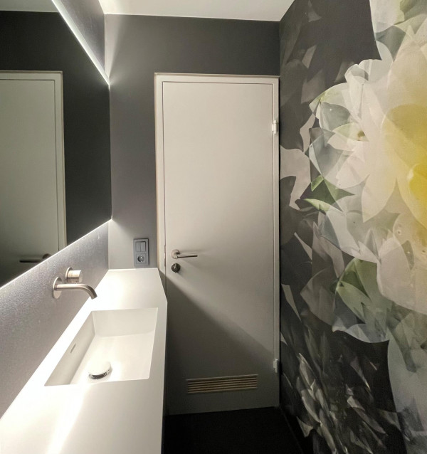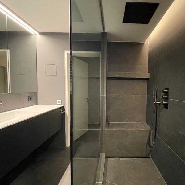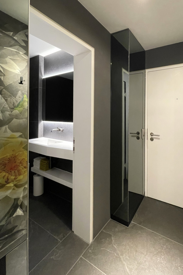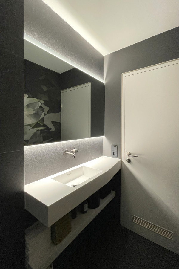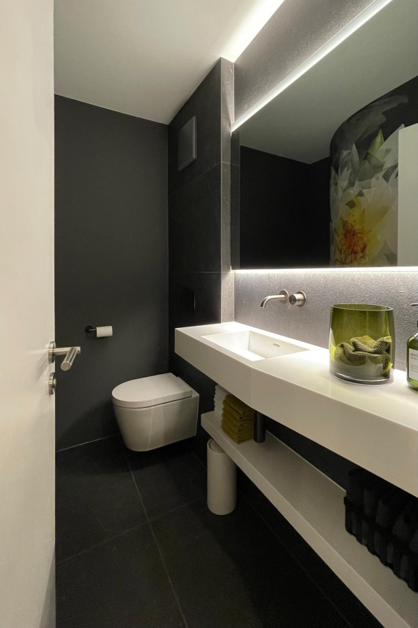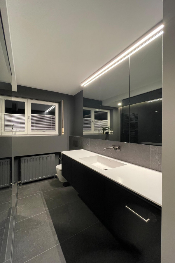 Gesamtentwurf, Detailplanung und Realisierung eines Gäste- WC's, anschliessendem Eingangsflur und Masterbad. Waschtischanlage mit Einzelbecken und Stauraummöbel, Spiegelschrank, Dusche mit Sitzbank, Ablage und Festverglasung. Flächenbündige Kopfbrause in Deckenkoffer mit Lichtvoute, WC räumlich verändert. Gäste-WC mit individuellem Waschtisch und Ablage in Mineralwerkstoff, Lichtspiegel und farbiger Tapetenwand. Flur mit Einbauspiegelschrank für Schuhe und Heizkörperverkleidung und farbiger Tapete wie Gäste WC. Alles nach Eigenentwurf, inklusive Material-, Farb- und Lichtkonzept.