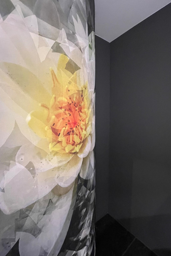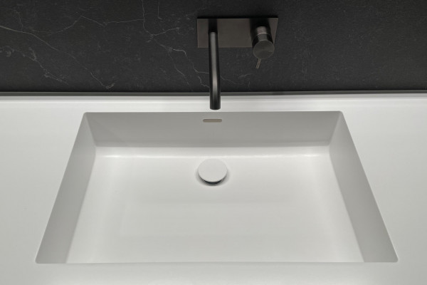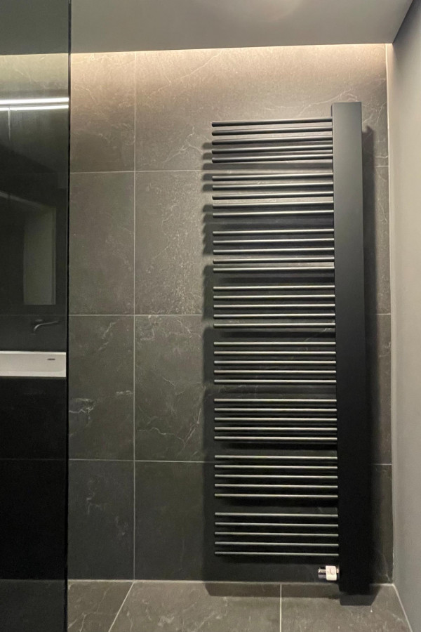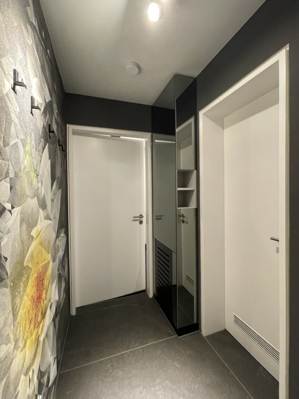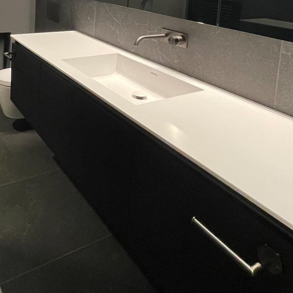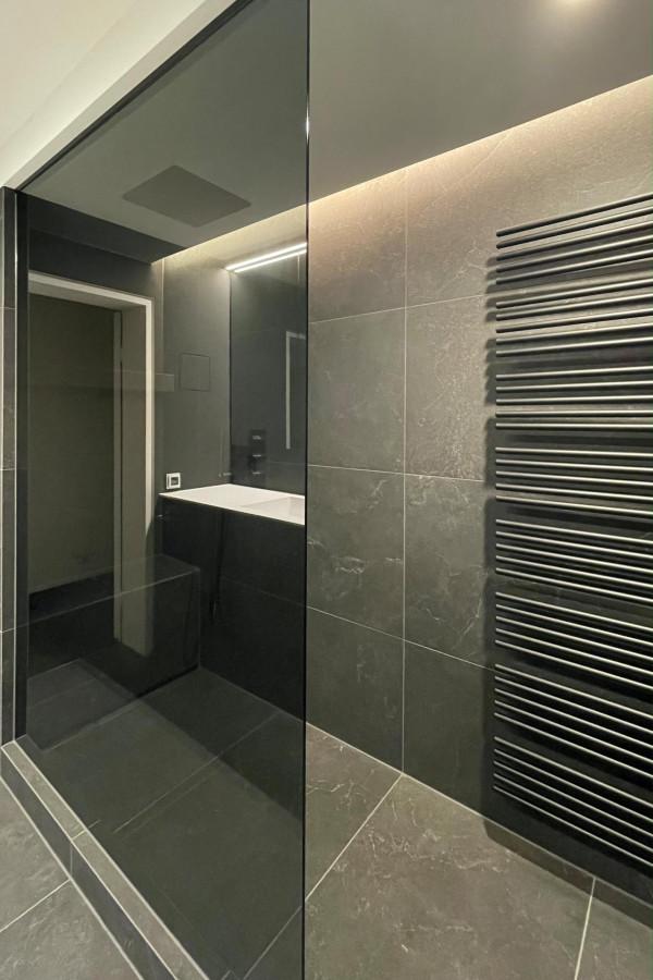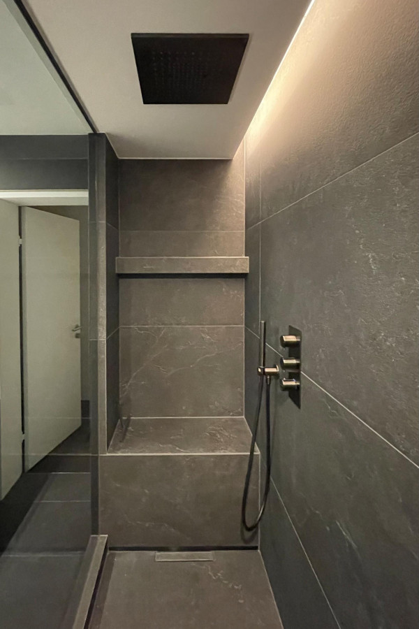 Gesamtentwurf, Detailplanung und Realisierung eines Gäste- WC's, anschliessendem Eingangsflur und Masterbad. Waschtischanlage mit Einzelbecken und Stauraummöbel, Spiegelschrank, Dusche mit Sitzbank, Ablage und Festverglasung. Flächenbündige Kopfbrause in Deckenkoffer mit Lichtvoute, WC räumlich verändert. Gäste-WC mit individuellem Waschtisch und Ablage in Mineralwerkstoff, Lichtspiegel und farbiger Tapetenwand. Flur mit Einbauspiegelschrank für Schuhe und Heizkörperverkleidung und farbiger Tapete wie Gäste WC. Alles nach Eigenentwurf, inklusive Material-, Farb- und Lichtkonzept.