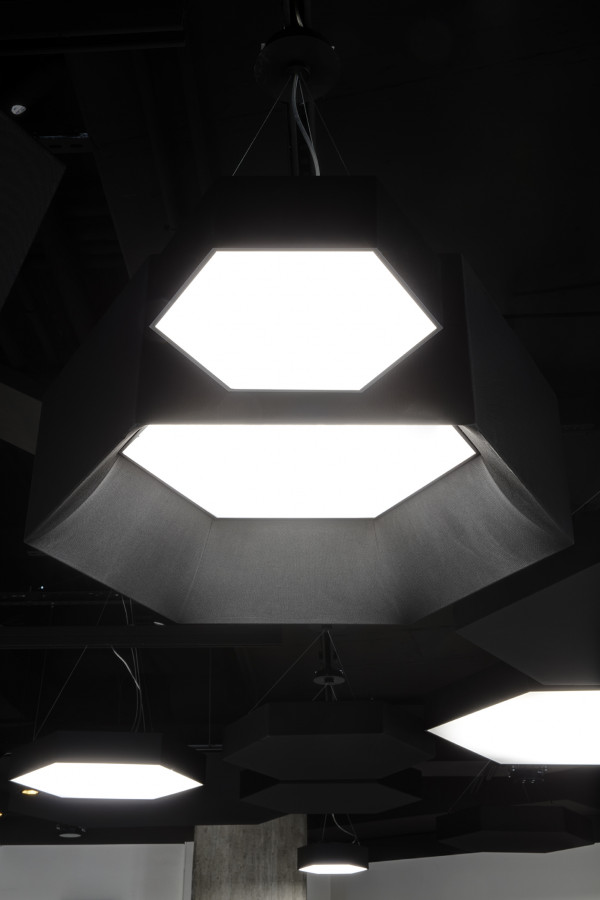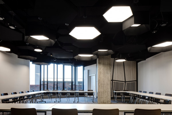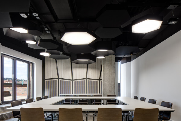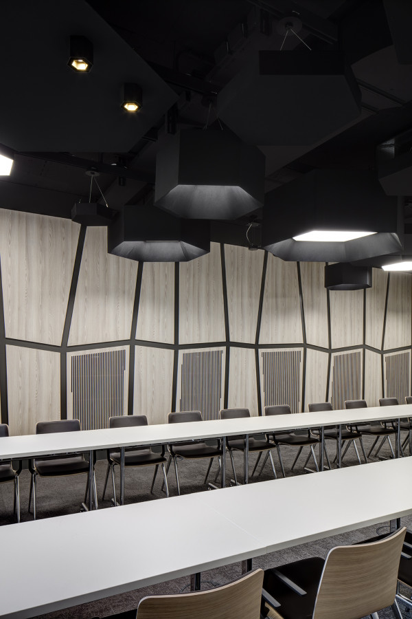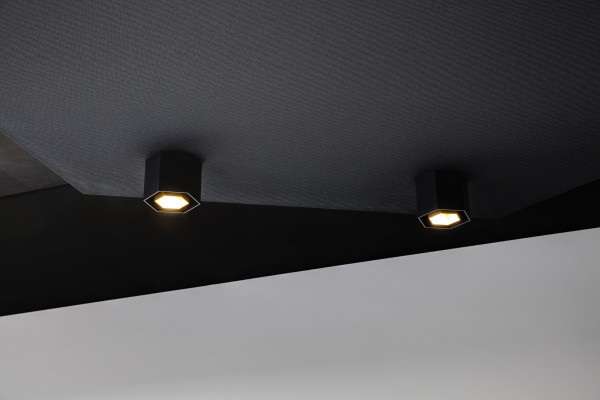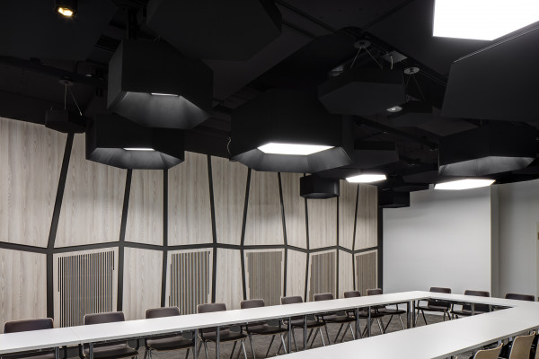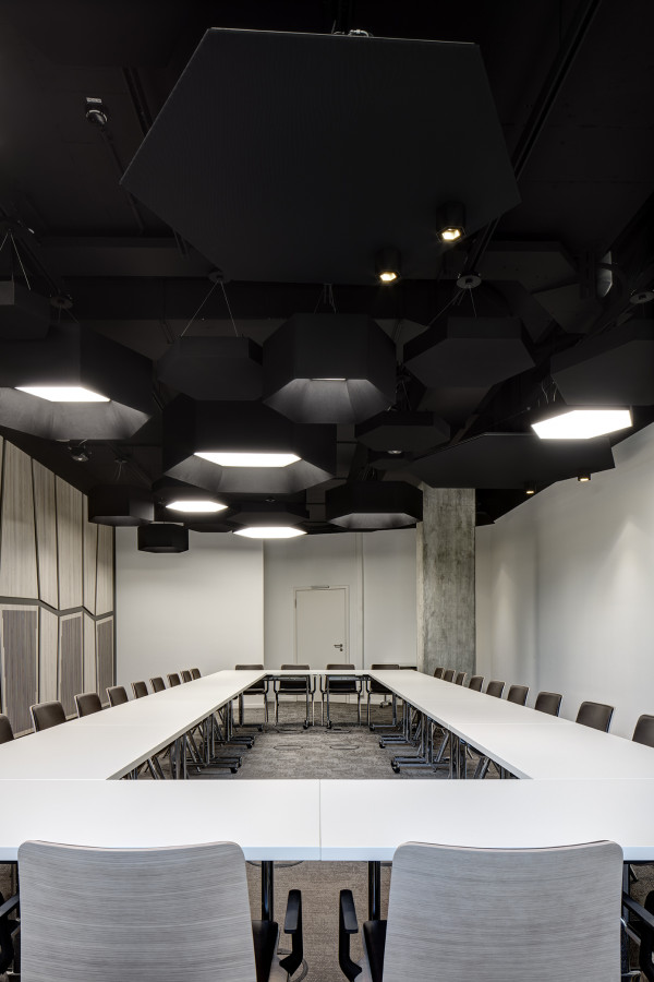 Unser Gestaltungskonzept greift die polygonale Grundriss-Struktur des Architekten Rolf Gutbrod auf: Klima- und Haustechnik werden hinter polygonalen Wandpaneelen verborgen, deren mikroperforierte Oberflächen die Raumakustik optimieren. Weltweit erstmalig setzen wir das Schallabsorbierung und Beleuchtung vereinende, hexagonale Leuchtensystem HEX-O von XAL ein. Zusätzlich wird die Deckenstruktur mit Akustikelementen ergänzt, was eine maximal flexible Raumnutzung erlaubt. Mit individuell programmierbaren Spotlights und modernsten LED-Leuchten können situationsgerechte Lichtstimmungen inszeniert werden.