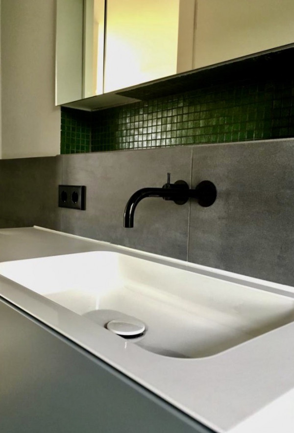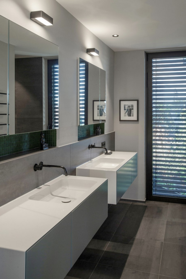 Entwurf, Detailplanung und Realisierung eines schmallen Schlauchbades in klassischer T-Lösung für begehbarer Dusche und separat getrenntem WC, 2 x Möbelwaschtische und Einbauspiegelschrank, inklusive Material-, Farb- und Lichtkonzept.