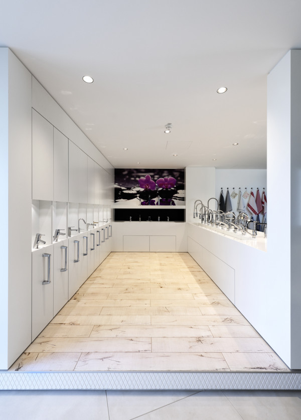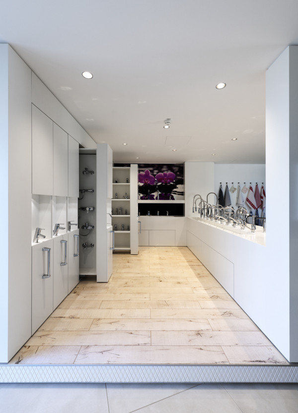 Für verschiedenste Themenfelder der Bad- und Küchenplanung wurden individuelle Beratungskonzepte entwickelt: Auf einer langen Theke sind beispielsweise Küchenarmaturen verschiedenster Hersteller aufgereiht – sie sind angeschlossen und können sofort getestet werden. In einer Schrankwand wurden Waschtischmischer vor Auszügen installiert. Wer sich für eine Serie interessiert, zieht einfach den Auszug heraus und hat alle Komponenten vor sich. Liegt das Augenmerk eher auf der Marke, bieten sogenannte Markenbühnen einen Überblick über alle Produkte eines Herstellers.
