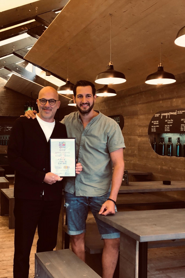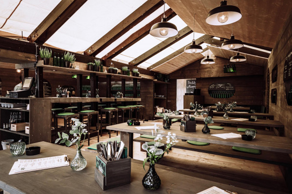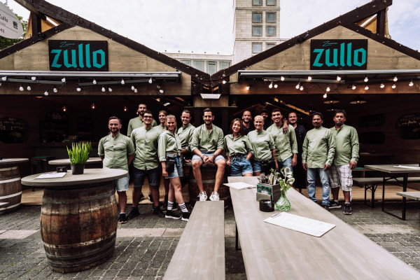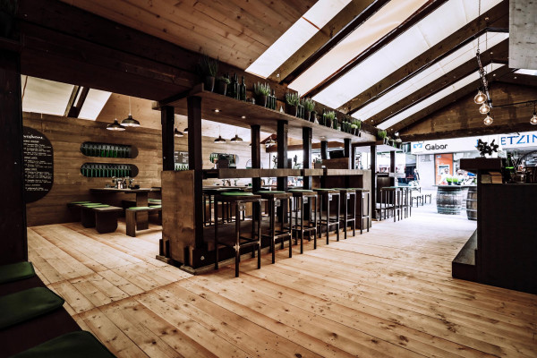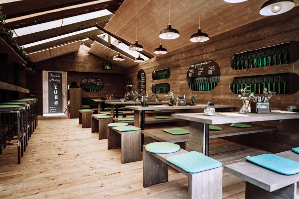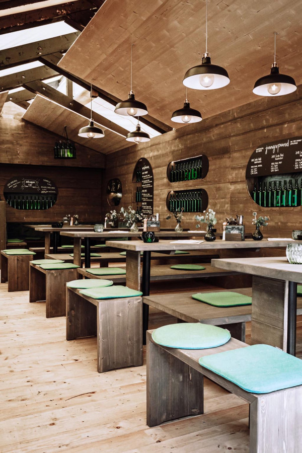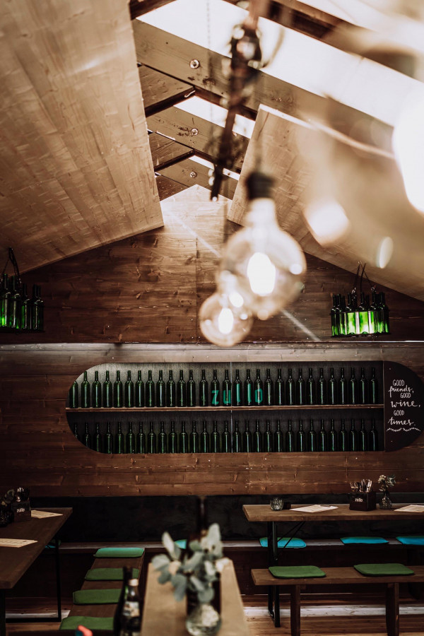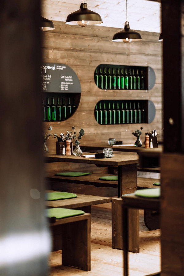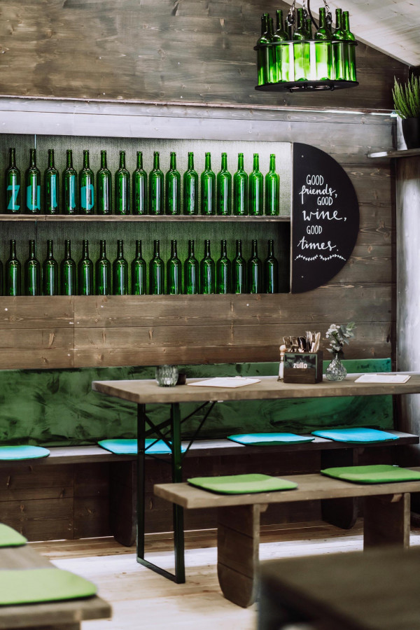 Das Konzept: Reduce to the max. Naturbelassenes Holz trifft auf grünes Glas. In Form von Flaschenleuchten, Stoff als Bezüge für die Sitzpolster, Barfront und Regalrückwände, indirekter Beleuchtung für die Wandregale. Das Ergebnis: eine angenehm entspannte Atmosphäre; irgendwo zwischen Festzelt, Club und Café. Frisch. Zwanglos. Und am Puls der Zeit. Abgerundet von einer bis ins Detail durchdachten Brand Identity in Zusammenarbeit mit Hochburg Design, konnte das „Zum Zullo“ gleich beim ersten Antritt bei der Laubenprämierung so den ersten Preis für sich verbuchen.